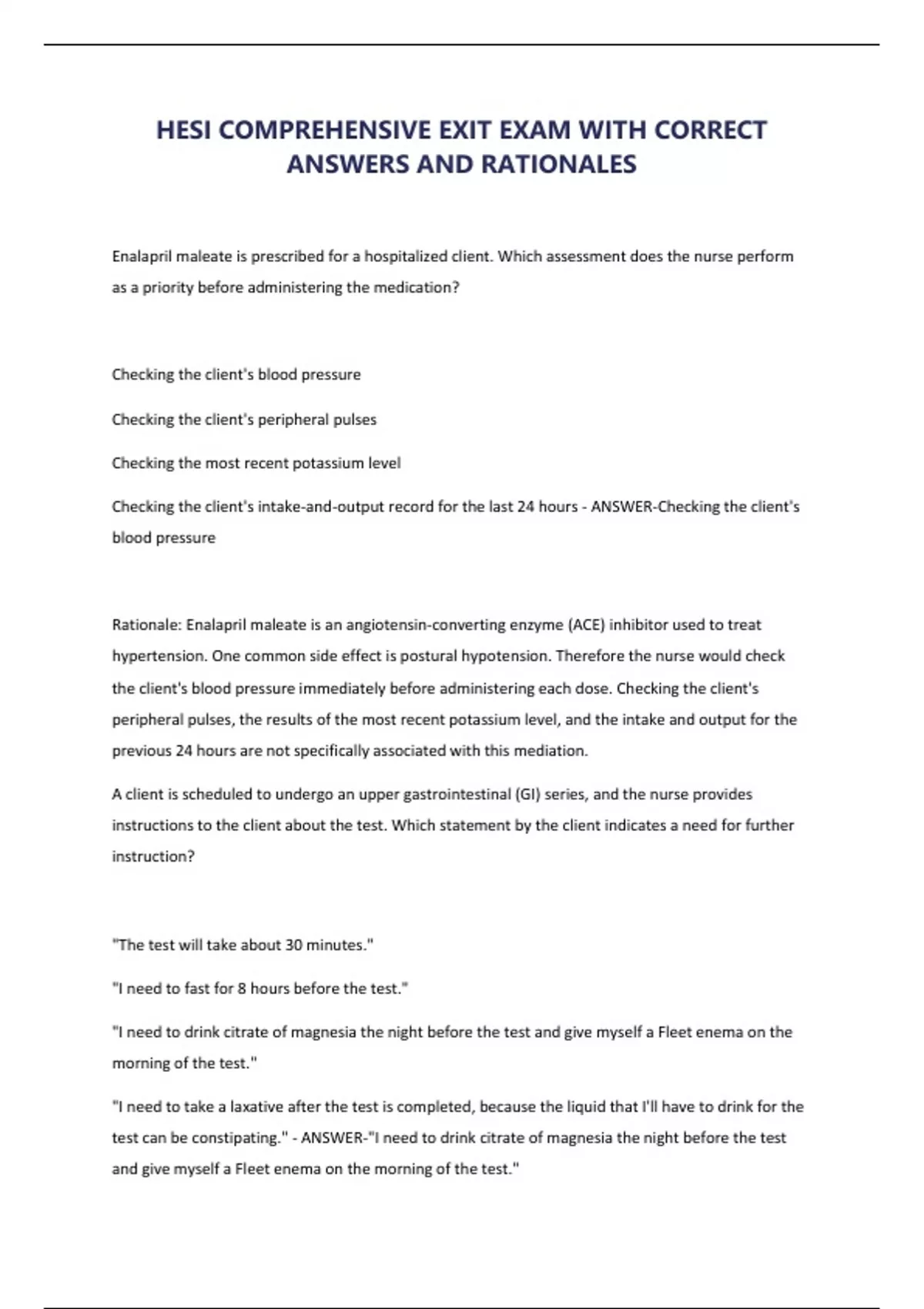 HESI COMPREHENSIVE EXIT EXAM WITH CORRECT ANSWERS AND RATIONALES