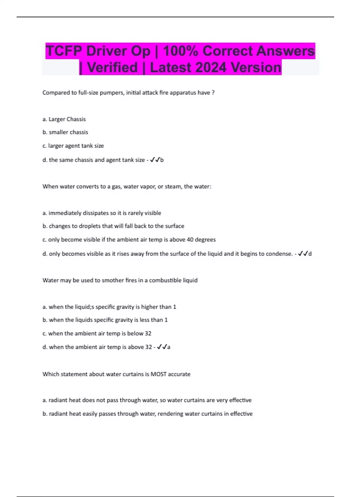 Compared to full-size pumpers, initial attack fire apparatus have ? a. Larger Chassis b. smaller chassis c. larger agent tank size d. the same chassis and agent tank size - b When water converts to a gas, water vapor, or steam, the water: a. immediately dissipates so it is rarely visible b. changes to droplets that will fall back to the surface c. only become visible if the ambient air temp is above 40 degrees d. only becomes visible as it rises away from the surface of the liquid and it begins to condense. - d Water may be used to smother fires in a combustible liquid a. when the liquid;s specific gravity is higher than 1 b. when the liquids specific gravity is less than 1 c. when the ambient air temp is below 32 d. when the ambient air temp is above 32 - a