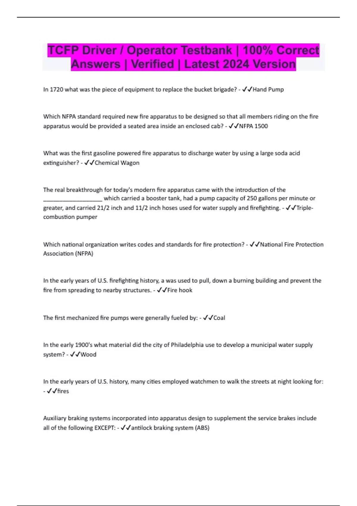 TCFP Driver / Operator Testbank | 100% Correct Answers | Verified | Latest 2024 Version