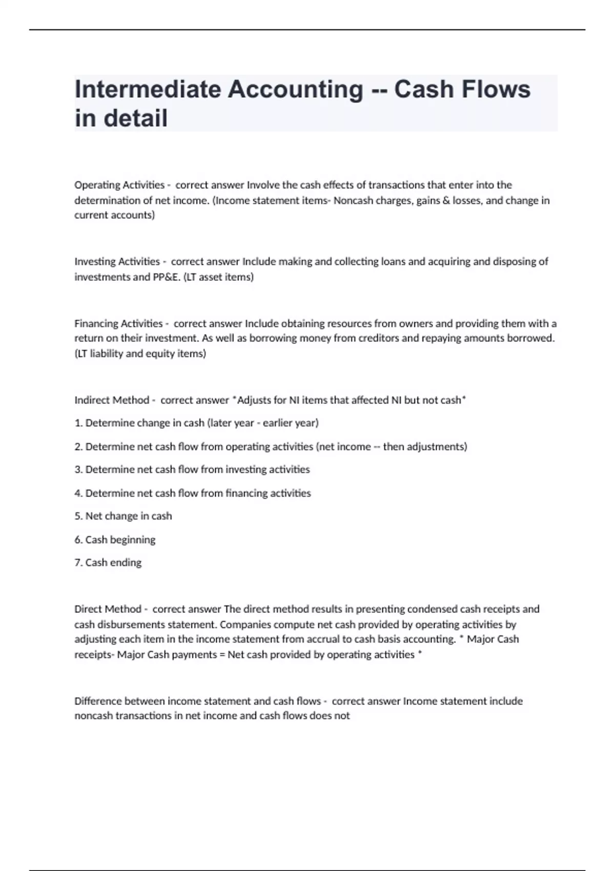 Intermediate Accounting -- Cash Flows in detailOperating Activities - correct answer Involve the cash effects of transactions that enter into the determination of net income. (Income statement items- Noncash charges, gains & losses, and change in current accounts) Investing Activities - correct answer Include making and collecting loans and acquiring and disposing of investments and PP&E. (LT asset items) Financing Activities - correct answer Include obtaining resources from owners and providing them with a return on their investment. As well as borrowing money from creditors and repaying amounts borrowed. (LT liability and equity items) Indirect Method - correct answer *Adjusts for NI items that affected NI but not cash* 1. Determine change in cash (later year - earlier year) 2. Determine net cash flow from operating activities (net income -- then adjustments) 3. Determine net cash flow from investing activities 4. Determine net cash flow from financing activities 5. Net change in cash 6. Cash beginning 7. Cash ending Direct Method - correct answer The direct method results in presenting condensed cash receipts and cash disbursements statement. Companies compute net cash provided by operating activities by adjusting each item in the income statement from accrual to cash basis accounting. * Major Cash receipts- Major Cash payments = Net cash provided by operating activities * Difference between income statement and cash flows - correct answer Income statement include noncash transactions in net income and cash flows does not