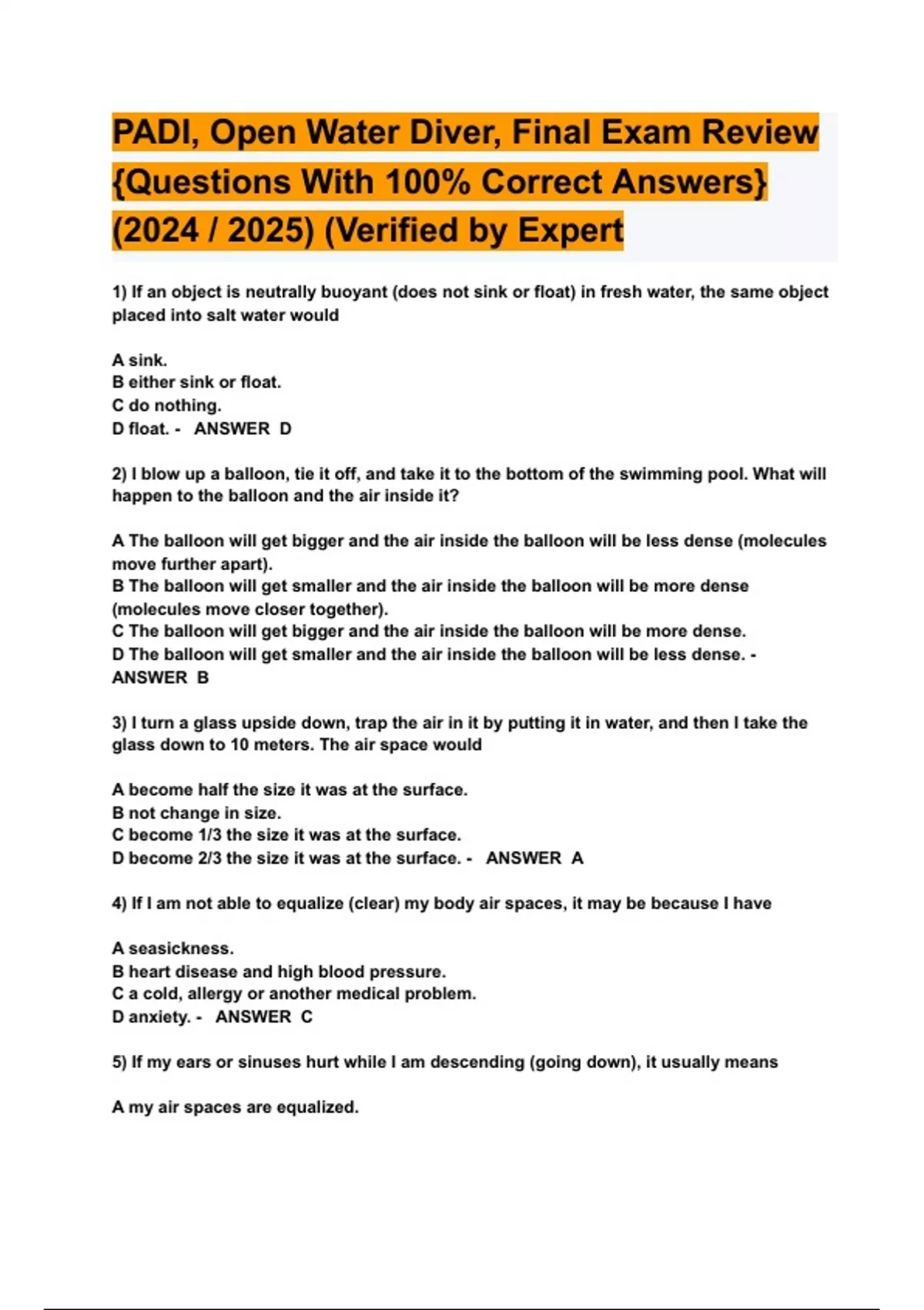 PADI, Open Water Diver, Final Exam Review {Questions With 100% Correct Answers} (2024 / 2025) (Verified by Expert