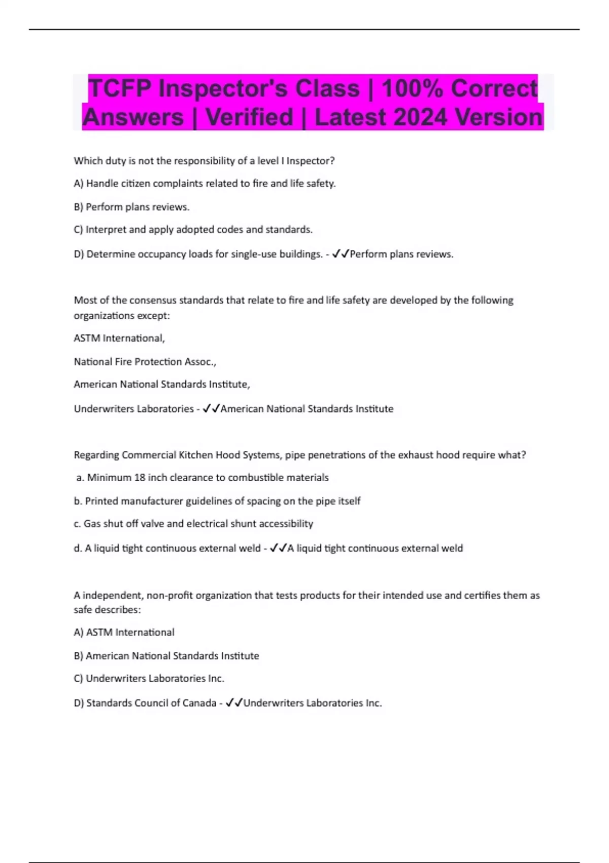 Which duty is not the responsibility of a level I Inspector? A) Handle citizen complaints related to fire and life safety. B) Perform plans reviews. C) Interpret and apply adopted codes and standards. D) Determine occupancy loads for single-use buildings. - Perform plans reviews. Most of the consensus standards that relate to fire and life safety are developed by the following organizations except: ASTM International, National Fire Protection Assoc., American National Standards Institute, Underwriters Laboratories - American National Standards Institute Regarding Commercial Kitchen Hood Systems, pipe penetrations of the exhaust hood require what? a. Minimum 18 inch clearance to combustible materials b. Printed manufacturer guidelines of spacing on the pipe itself c. Gas shut off valve and electrical shunt accessibility d. A liquid tight continuous external weld - A liquid tight continuous external weld A independent, non-profit organization that tests products for their intended use and certifies them as safe describes: A) ASTM International B) American National Standards Institute C) Underwriters Laboratories Inc. D) Standards Council of Canada - Underwriters Laboratories Inc