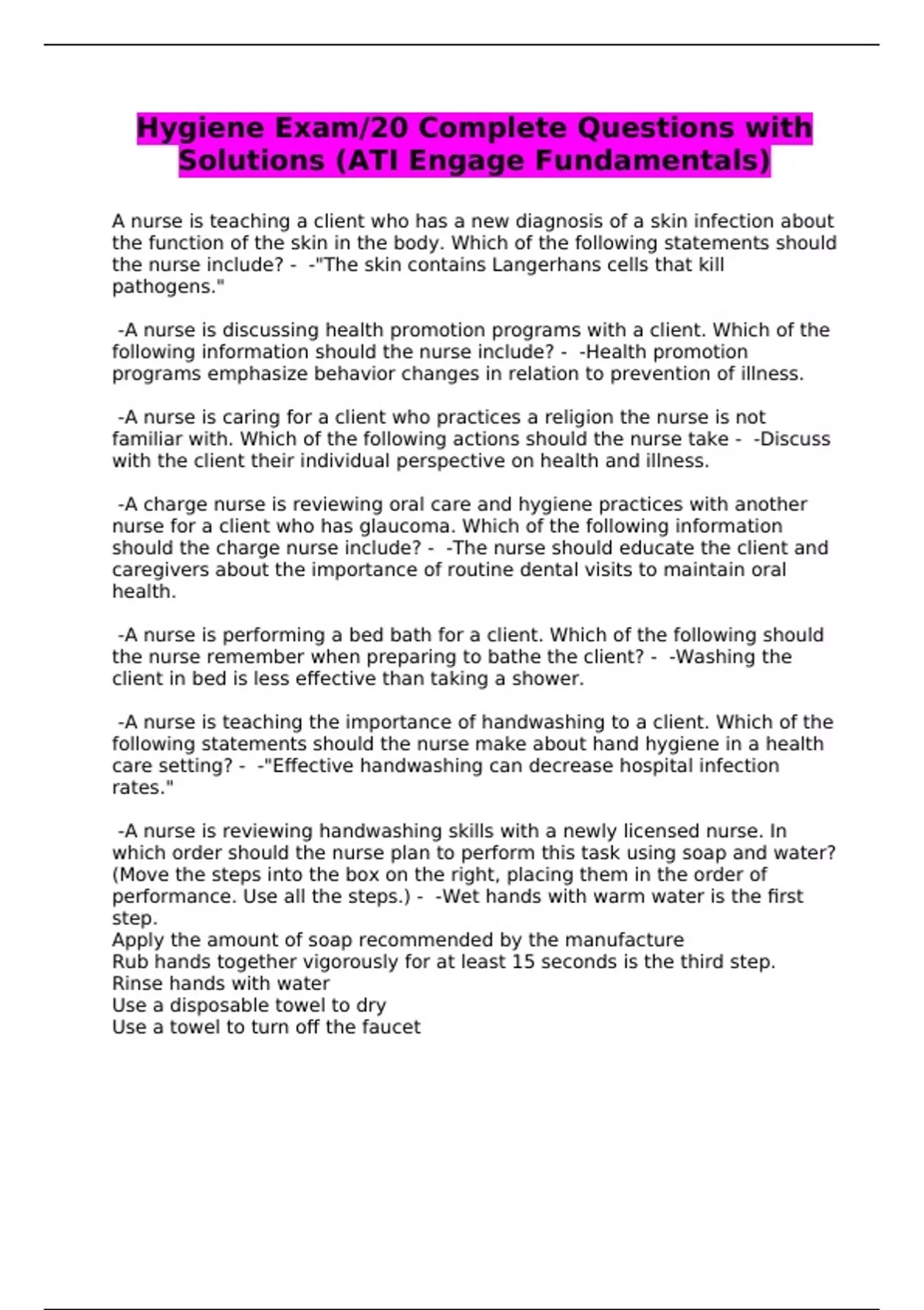 Hygiene Exam/20 Complete Questions with Solutions (ATI Engage Fundamentals)