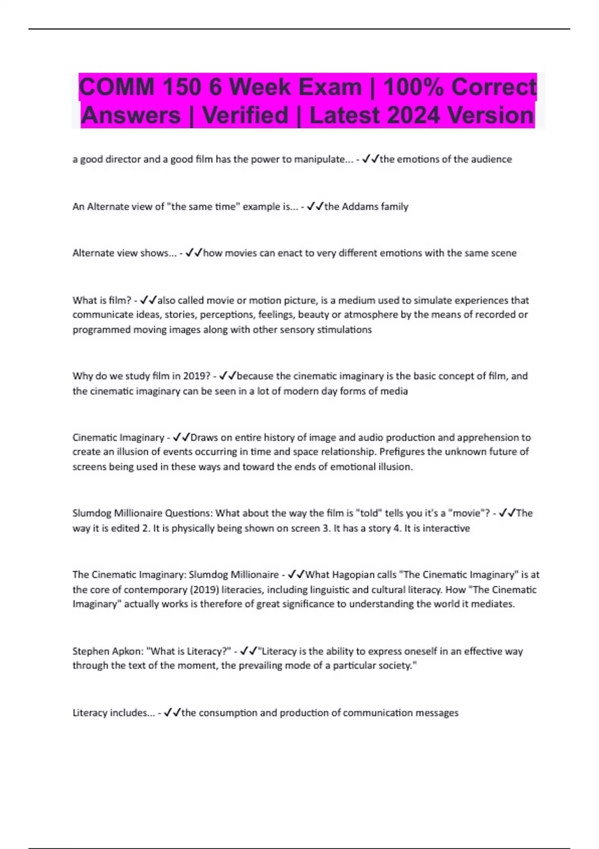 COMM 150 6 Week Exam | 100% Correct Answers | Verified | Latest 2024 Version