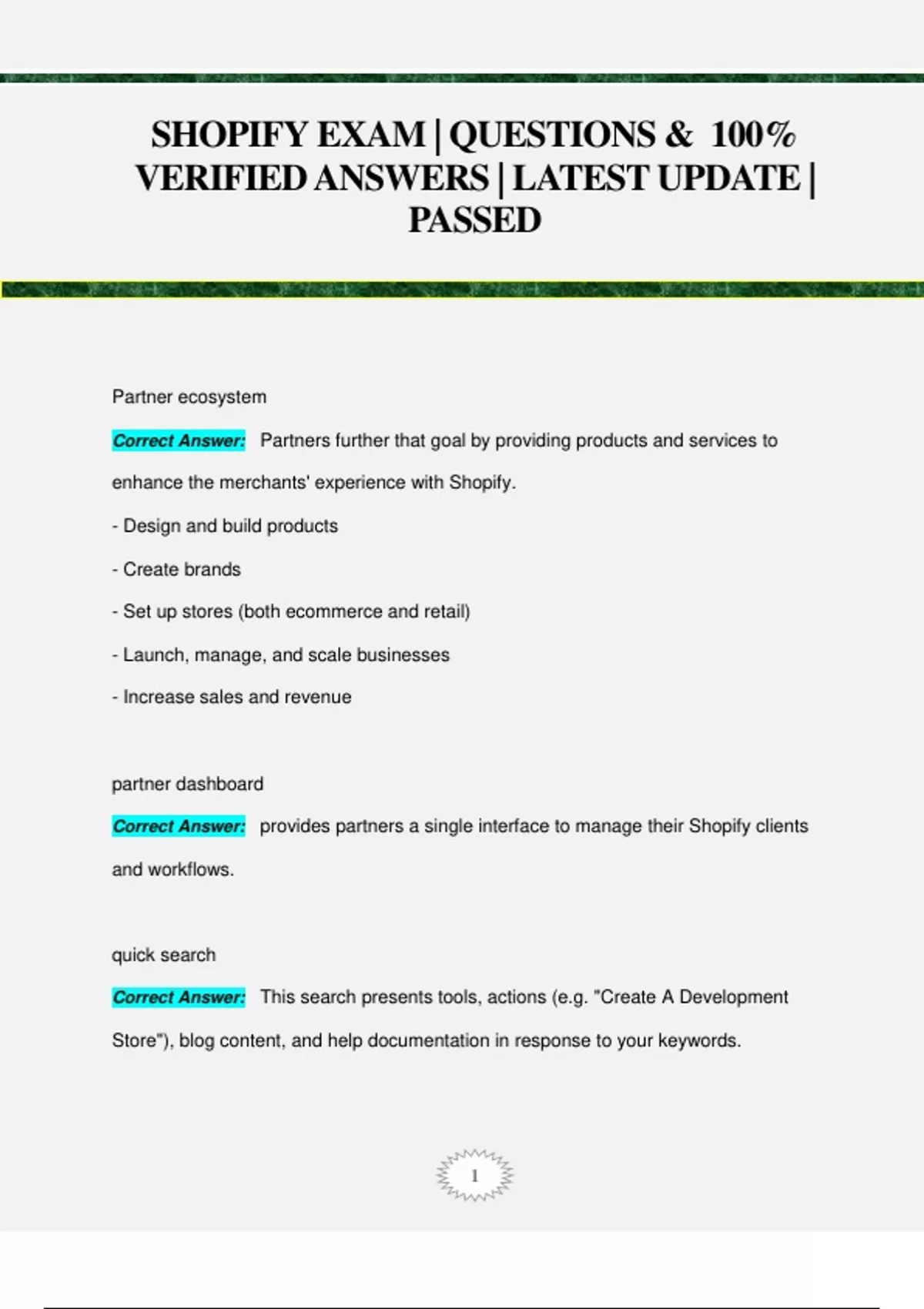 SHOPIFY EXAM | QUESTIONS & 100% VERIFIEDANSWERS | LATEST UPDATE | PASSED Partner ecosystem Correct Answer: Partners further that goal by providing products and services to enhance the merchants' experience with Shopify. - Design and build products - Create brands - Set up stores (both ecommerce and retail) - Launch, manage, and scale businesses - Increase sales and revenue partner dashboard Correct Answer: provides partners a single interface to manage their Shopify clients and workflows. quick search Correct Answer: This search presents tools, actions (e.g. "Create A Development Store"), blog content, and help documentation in response to your keywords. 2 development stores Correct Answer: free sandbox environments containing all the functionality of the Shopify Advanced plan (with a few restrictions). You can use these environments to develop custom themes and apps, or set up a store for a client. - no limit to this number Where can the ownership of a development store be transferred? Correct Answer: to a merchant collaborator accounts Correct Answer: Managed stores are stores that, while owned by a merchant, you would have access to as a collaborator. For this purpose, Shopify has created collaborator accounts. These accounts provide a simple and secure way for partners to gain access to, and work on merchant stores. With collaborator accounts, partners can request access to a merchant store and merchants can set the permissions of the partner. referral tracking and reports Correct Answer: ou will be able to view and track all of your referrals within the Partner dashboard. You will also have access to specific reports and tools in order to: - View your referred stores activity - Display an overview of the clicks, trial signups, paid conversions, and earnings for each of your affiliate campaigns 3 - View your revenue share payouts - Submit Shopify Plus referrals apps and themes Correct Answer: the Apps and Themes pages within the Partner Dashboard will allow you to manage any public apps or themes you have created. From here you will be able to: - Generate API keys fo
