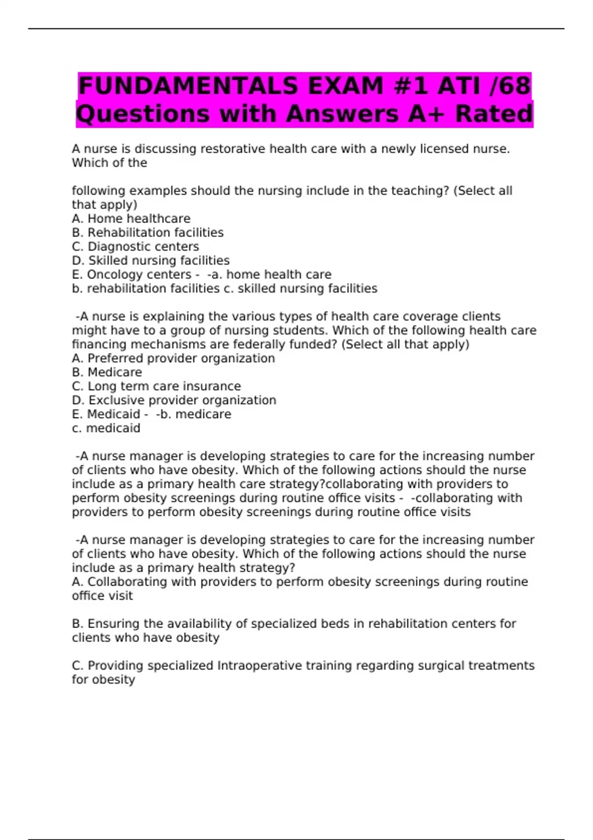 FUNDAMENTALS EXAM #1 ATI /68 Questions with Answers A+ Rated