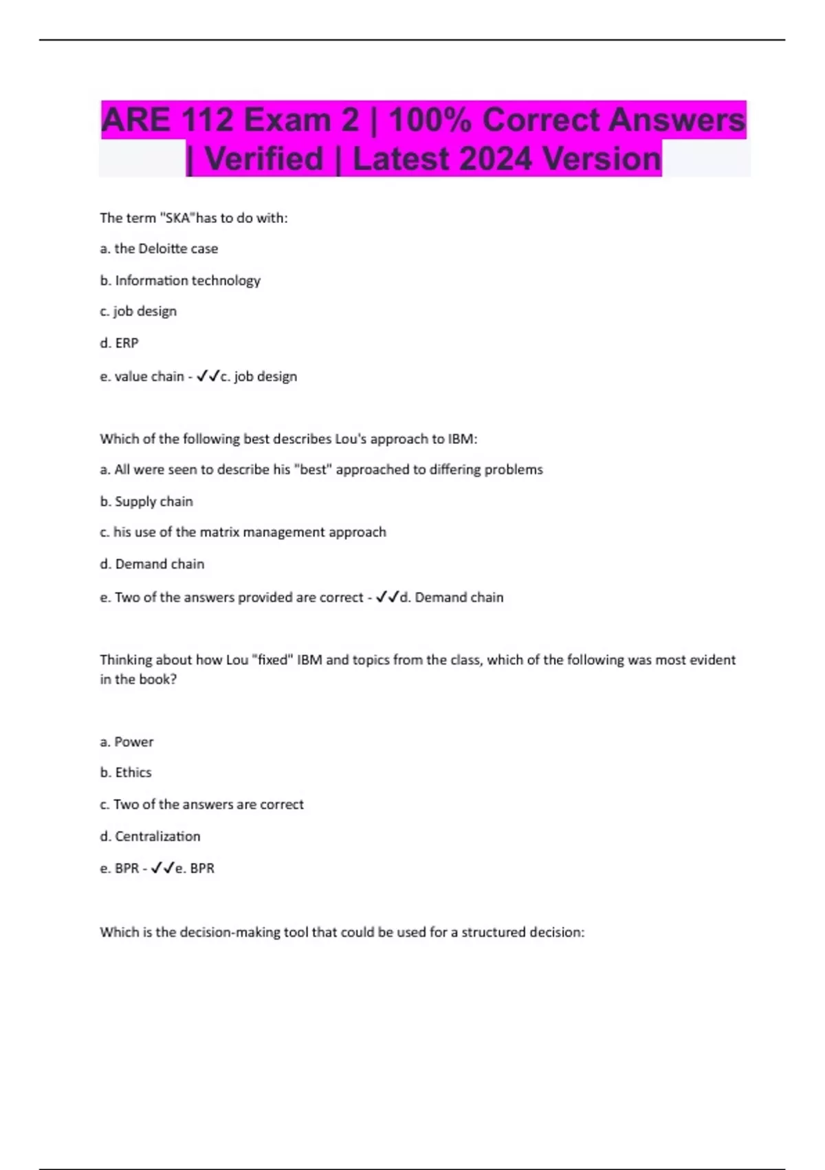 The term "SKA"has to do with: a. the Deloitte case b. Information technology c. job design d. ERP e. value chain - c. job design Which of the following best describes Lou's approach to IBM: a. All were seen to describe his "best" approached to differing problems b. Supply chain c. his use of the matrix management approach d. Demand chain e. Two of the answers provided are correct - d. Demand chain Thinking about how Lou "fixed" IBM and topics from the class, which of the following was most evident in the book? a. Power b. Ethics c. Two of the answers are correct d. Centralization e. BPR - e. BPR Which is the decision-making tool that could be used for a structured decision: