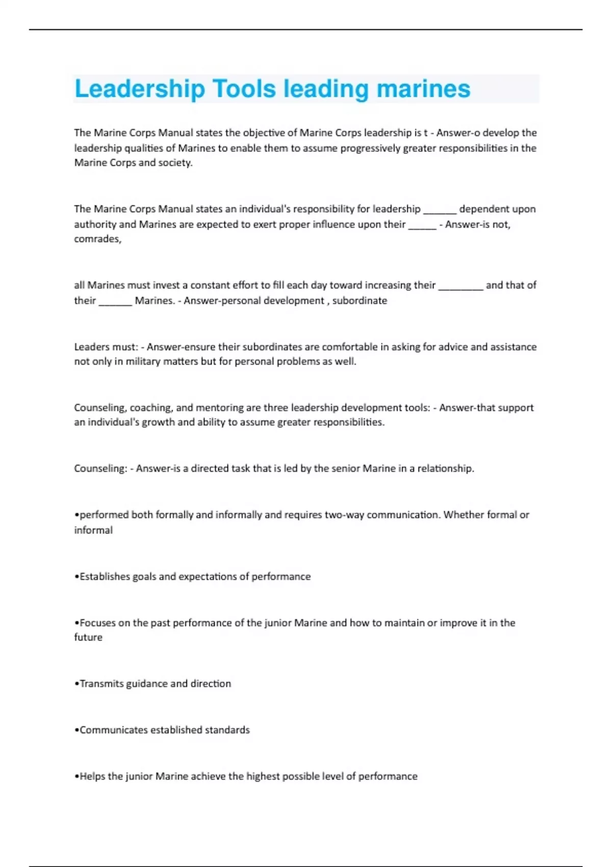 The Marine Corps Manual states the objective of Marine Corps leadership is t - Answer-o develop the leadership qualities of Marines to enable them to assume progressively greater responsibilities in the Marine Corps and society. The Marine Corps Manual states an individual's responsibility for leadership ______ dependent upon authority and Marines are expected to exert proper influence upon their _____ - Answer-is not, comrades, all Marines must invest a constant effort to fill each day toward increasing their ________ and that of their ______ Marines. - Answer-personal development , subordinate Leaders must: - Answer-ensure their subordinates are comfortable in asking for advice and assistance not only in military matters but for personal problems as well. Counseling, coaching, and mentoring are three leadership development tools: - Answer-that support an individual's growth and ability to assume greater responsibilities. Counseling: - Answer-is a directed task that is led by the senior Marine in a relationship. •performed both formally and informally and requires two-way communication. Whether formal or informal •Establishes goals and expectations of performance •Focuses on the past performance of the junior Marine and how to maintain or improve it in the future •Transmits guidance and direction •Communicates established standards •Helps the junior Marine achieve the highest possible level of performanceCounseling conducted on a regular basis - Answer-•will prevent surprises during proficiency and conduct marking periods and provides a means to assist Marine leaders and their Marines to continuously improve individual performance. •This process establishes effective means of communication and understanding between senior and junior, improving Marine Corps readiness. •Are regularly scheduled and conducted. •Occur with each Marine for which the leader is directly responsible. •Establish standards of performance expected to improve unit readiness and individual development. Coaching is - Answer-generally an informal process by which the coach (someone with more experience) provides the coached (someone with less experience) with assistance in learning how to better accomplish a task. Coaching is: •Designed to improve a Marine's ability to accomplish a task or complete an event •Part of daily operations •The most common form of leadership interaction as it occurs at every level and in every condition where an individual Marine provides another, or group of others, with the benefit of his or her experience. Mentoring is - Answer-a less formal process than coaching and counseling and provides the Marine with a greater depth of knowledge, experience, or maturity as a result of the guidance of the mentor. Mentoring: •Is a voluntary, developmental relationship between an experienced person and one of lesser experience •Is characterized by mutual trust and respect•Often occurs outside the chain of command •Can be Initiated by either the senior or the junior •Typically endures beyond a single tour of duty the cornerstone of General LeJeune's "teacher/scholar" model of interaction between senior and junior Marines.