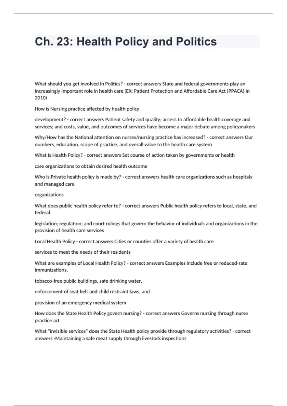 Ch. 23: Health Policy and Politics What should you get involved in Politics? - correct answers State and federal governments play an increasingly important role in health care (EX: Patient Protection and Affordable Care Act (PPACA) in 2010) How is Nursing practice affected by health policy development? - correct answers Patient safety and quality; access to affordable health coverage and services; and costs, value, and outcomes of services have become a major debate among policymakers Why/How has the National attention on nurses/nursing practice has increased? - correct answers Our numbers, education, scope of practice, and overall value to the health care system What Is Health Policy? - correct answers Set course of action taken by governments or health care organizations to obtain desired health outcome Who is Private health policy is made by? - correct answers health care organizations such as hospitals and managed care organizations What does public health policy refer to? - correct answers Public health policy refers to local, state, and federal legislation; regulation; and court rulings that govern the behavior of individuals and organizations in the provision of health care services Local Health Policy - correct answers Cities or counties offer a variety of health care services to meet the needs of their residents What are examples of Local Health Policy? - correct answers Examples include free or reduced-rate immunizations, tobacco-free public buildings, safe drinking water, enforcement of seat belt and child restraint laws, and provision of an emergency medical system How does the State Health Policy govern nursing? - correct answers Governs nursing through nurse practice act What "invisible services" does the State Health policy provide through regulatory activities? - correct answers -Maintaining a safe meat supply through livestock inspections