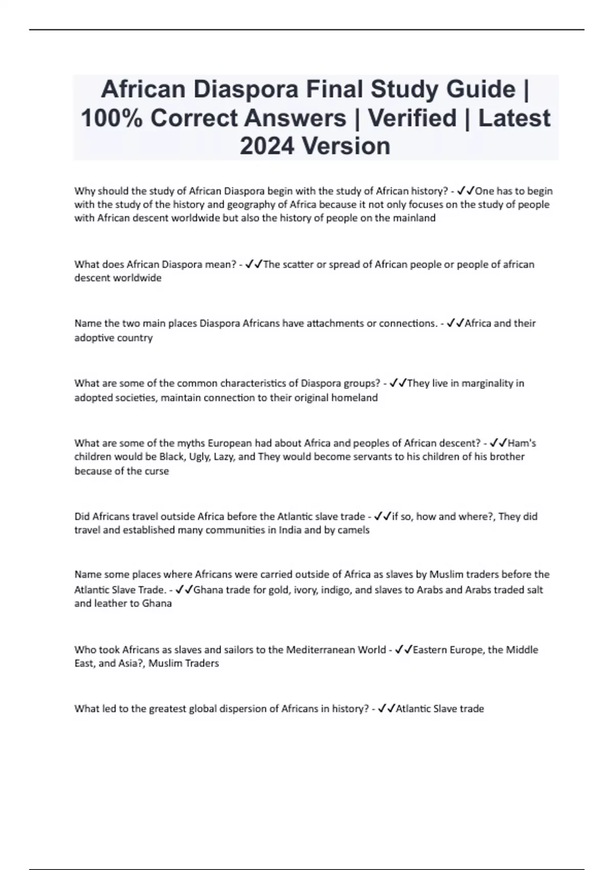 African Diaspora Final Study Guide | 100% Correct Answers | Verified | Latest 2024 Version