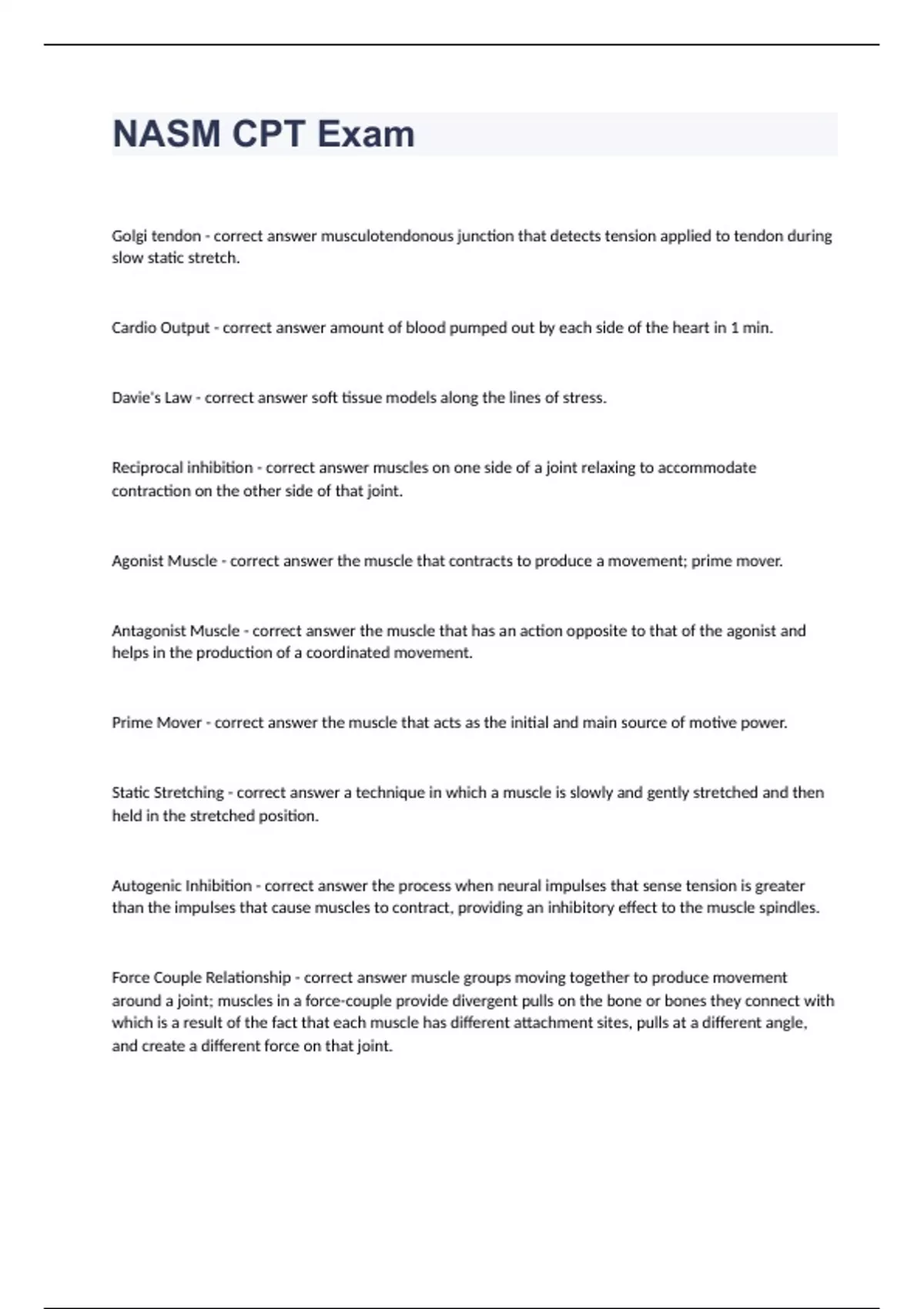 NASM CPT Exam Correctly Answered Questions 2024. Golgi tendon - correct answer musculotendonous junction that detects tension applied to tendon during slow static stretch. Cardio Output - correct answer amount of blood pumped out by each side of the heart in 1 min. Davie's Law - correct answer soft tissue models along the lines of stress. Reciprocal inhibition - correct answer muscles on one side of a joint relaxing to accommodate contraction on the other side of that joint. Agonist Muscle - correct answer the muscle that contracts to produce a movement; prime mover. Antagonist Muscle - correct answer the muscle that has an action opposite to that of the agonist and helps in the production of a coordinated movement. Prime Mover - correct answer the muscle that acts as the initial and main source of motive power.