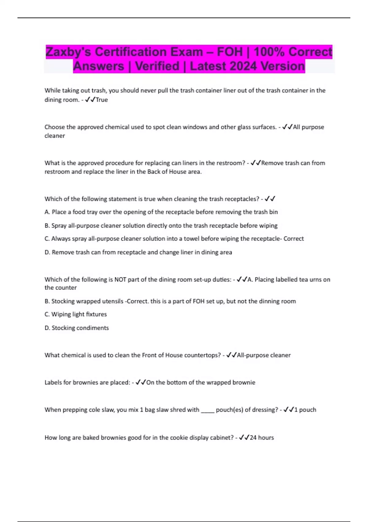 Zaxby's Certification Exam – FOH | 100% Correct Answers | Verified | Latest 2024 Version