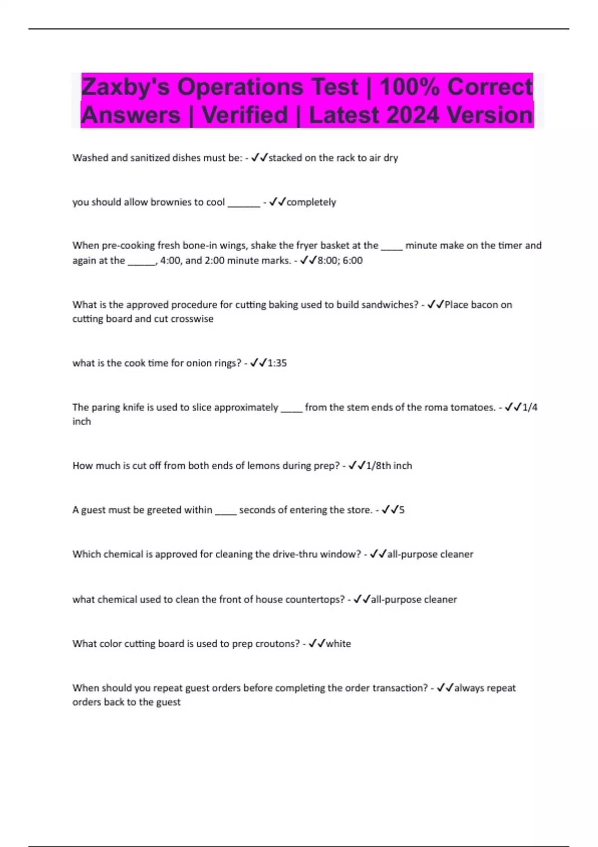 Zaxby's Operations Test | 100% Correct Answers | Verified | Latest 2024 Version