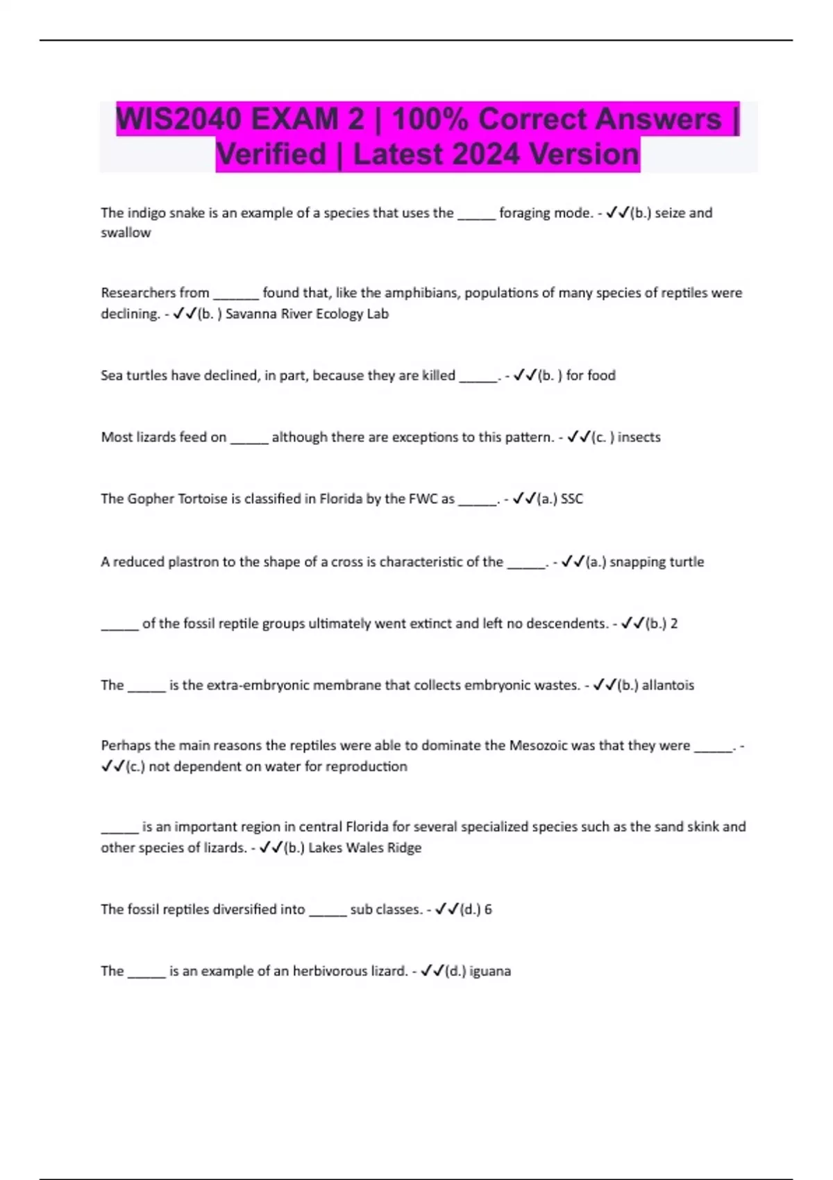 The indigo snake is an example of a species that uses the _____ foraging mode. - (b.) seize and swallow Researchers from ______ found that, like the amphibians, populations of many species of reptiles were declining. - (b. ) Savanna River Ecology Lab Sea turtles have declined, in part, because they are killed _____. - (b. ) for food Most lizards feed on _____ although there are exceptions to this pattern. - (c. ) insects The Gopher Tortoise is classified in Florida by the FWC as _____. - (a.) SSC A reduced plastron to the shape of a cross is characteristic of the _____. - (a.) snapping turtle _____ of the fossil reptile groups ultimately went extinct and left no descendents. - (b.) 2 The _____ is the extra-embryonic membrane that collects embryonic wastes. - (b.) allantois Perhaps the main reasons the reptiles were able to dominate the Mesozoic was that they were _____. - (c.) not dependent on water for reproduction _____ is an important region in central Florida for several specialized species such as the sand skink and other species of lizards. - (b.) Lakes Wales Ridge