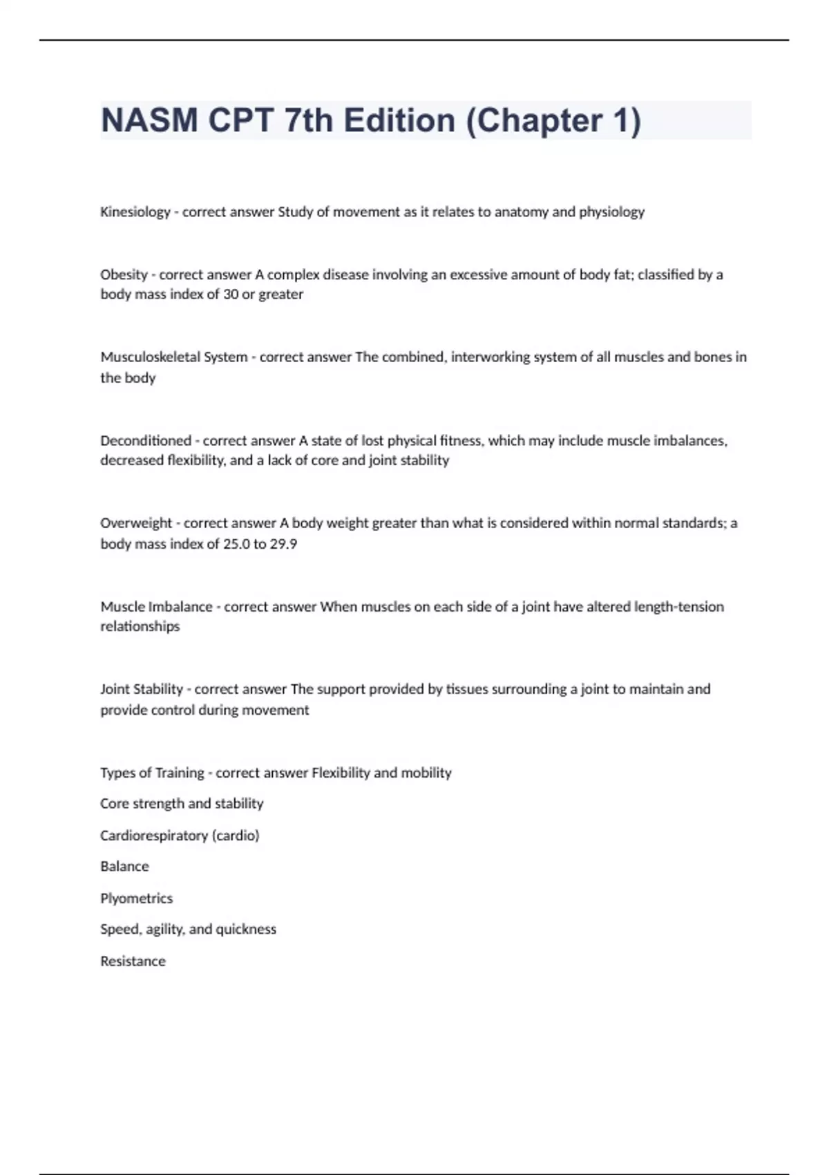 NASM CPT 7th Edition Chapter 1 Questions Correctly Answered 2024.Kinesiology - correct answer Study of movement as it relates to anatomy and physiology Obesity - correct answer A complex disease involving an excessive amount of body fat; classified by a body mass index of 30 or greater Musculoskeletal System - correct answer The combined, interworking system of all muscles and bones in the body Deconditioned - correct answer A state of lost physical fitness, which may include muscle imbalances, decreased flexibility, and a lack of core and joint stability Overweight - correct answer A body weight greater than what is considered within normal standards; a body mass index of 25.0 to 29.9 Muscle Imbalance - correct answer When muscles on each side of a joint have altered length-tension relationships Joint Stability - correct answer The support provided by tissues surrounding a joint to maintain and provide control during movement Types of Training - correct answer Flexibility and mobility Core strength and stability Cardiorespiratory (cardio) Balance Plyometrics Speed, agility, and quickness Resistance