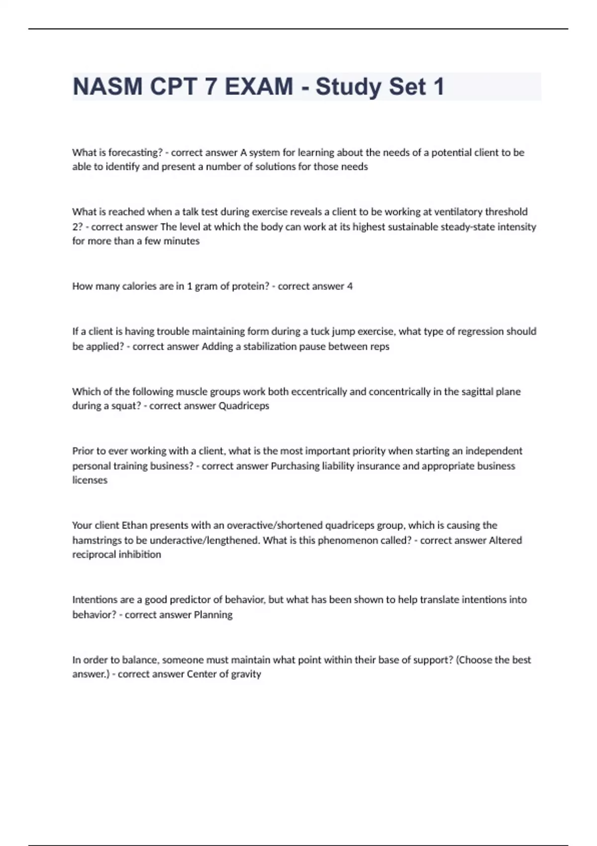 NASM CPT 7 EXAM - Study Set 1 Correctly Answered Test Exam 2024. What is forecasting? - correct answer A system for learning about the needs of a potential client to be able to identify and present a number of solutions for those needs What is reached when a talk test during exercise reveals a client to be working at ventilatory threshold 2? - correct answer The level at which the body can work at its highest sustainable steady-state intensity for more than a few minutes How many calories are in 1 gram of protein? - correct answer 4 If a client is having trouble maintaining form during a tuck jump exercise, what type of regression should be applied? - correct answer Adding a stabilization pause between reps Which of the following muscle groups work both eccentrically and concentrically in the sagittal plane during a squat? - correct answer Quadriceps Prior to ever working with a client, what is the most important priority when starting an independent personal training business? - correct answer Purchasing liability insurance and appropriate business licenses Your client Ethan presents with an overactive/shortened quadriceps group, which is causing the hamstrings to be underactive/lengthened. What is this phenomenon called? - correct answer Altered reciprocal inhibition Intentions are a good predictor of behavior, but what has been shown to help translate intentions into behavior? - correct answer Planning In order to balance, someone must maintain what point within their base of support? (Choose the best answer.) - correct answer Center of gravity