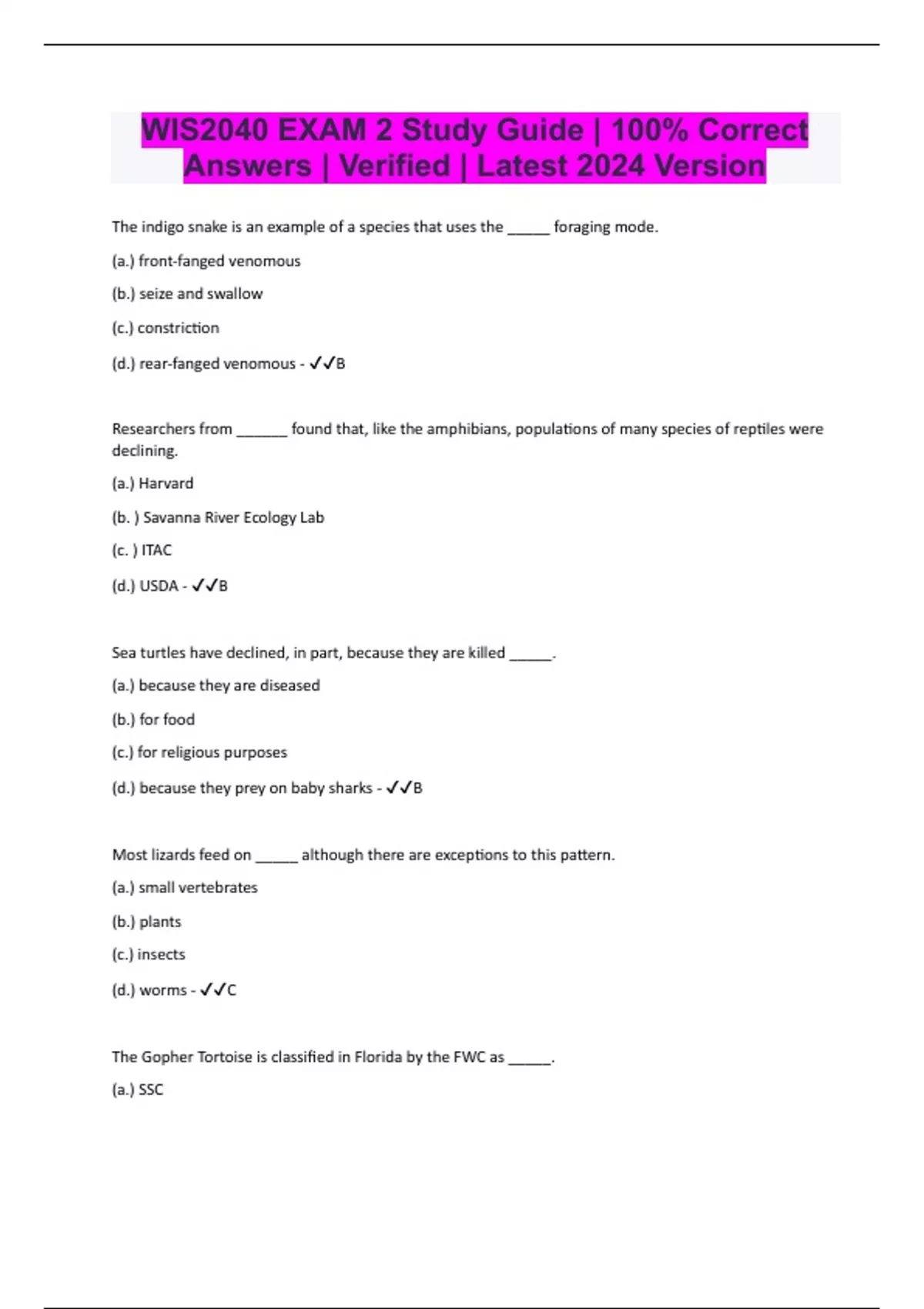 The indigo snake is an example of a species that uses the _____ foraging mode. (a.) front-fanged venomous (b.) seize and swallow (c.) constriction (d.) rear-fanged venomous - B Researchers from ______ found that, like the amphibians, populations of many species of reptiles were declining. (a.) Harvard (b. ) Savanna River Ecology Lab (c. ) ITAC (d.) USDA - B Sea turtles have declined, in part, because they are killed _____. (a.) because they are diseased (b.) for food (c.) for religious purposes (d.) because they prey on baby sharks - B Most lizards feed on _____ although there are exceptions to this pattern. (a.) small vertebrates (b.) plants (c.) insects (d.) worms - C The Gopher Tortoise is classified in Florida by the FWC as _____. (a.) SSC