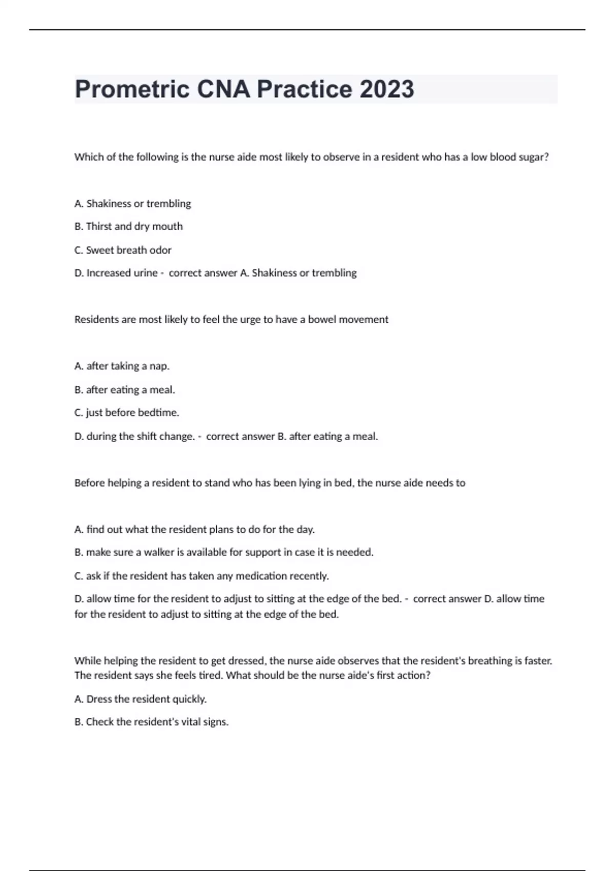 Prometric CNA Practice 2023 Which of the following is the nurse aide most likely to observe in a resident who has a low blood sugar? A. Shakiness or trembling B. Thirst and dry mouth C. Sweet breath odor D. Increased urine - correct answer A. Shakiness or trembling Residents are most likely to feel the urge to have a bowel movement A. after taking a nap. B. after eating a meal. C. just before bedtime. D. during the shift change. - correct answer B. after eating a meal. Before helping a resident to stand who has been lying in bed, the nurse aide needs to A. find out what the resident plans to do for the day. B. make sure a walker is available for support in case it is needed. C. ask if the resident has taken any medication recently. D. allow time for the resident to adjust to sitting at the edge of the bed. - correct answer D. allow time for the resident to adjust to sitting at the edge of the bed. While helping the resident to get dressed, the nurse aide observes that the resident's breathing is faster. The resident says she feels tired. What should be the nurse aide's first action? A. Dress the resident quickly. B. Check the resident's vital signs. C. Stop the dressing to let the resident rest. D. Go to find a nurse to check the resident. - correct answer C. Stop the dressing to let the resident rest. The nurse aide receives resident assignments from the charge nurse at the beginning of the shift. When planning priorities it will be most important for the nurse aide to A. decide break times with other nurse aides. B. review assignments with others to check if residents are divided evenly. C. check all assigned residents to see if anyone has immediate needs. D. check what the activity department has scheduled for residents during the shift. - correct answer C. check all assigned residents to see if anyone has immediate needs. The care plan requires that the resident be ambulated 100 feet twice a day at 10 a.m. and 2 p.m. When the nurse aide arrives to walk the resident at 10 a.m., the resident refuses. Which of the following is the best response by the nurse aide? A. "Maybe you can plan to walk a little further this afternoon." B. "The doctor ordered your walking exercise. You really need to try." C. "You have the right to refuse. Do you want me to tell the nurse?" D. "Would you prefer to walk a little later?" - correct answer D. "Would you prefer to walk a little later?" Which of the following is generally experienced by a resident with low blood sugar? A. Fever B. Weakness C. Sour breath D. Frequent urination - correct answer B. Weakness An alert resident has requested to be left alone with her husband who is visiting. The resident closes the door to her room. What should the nurse aide do?