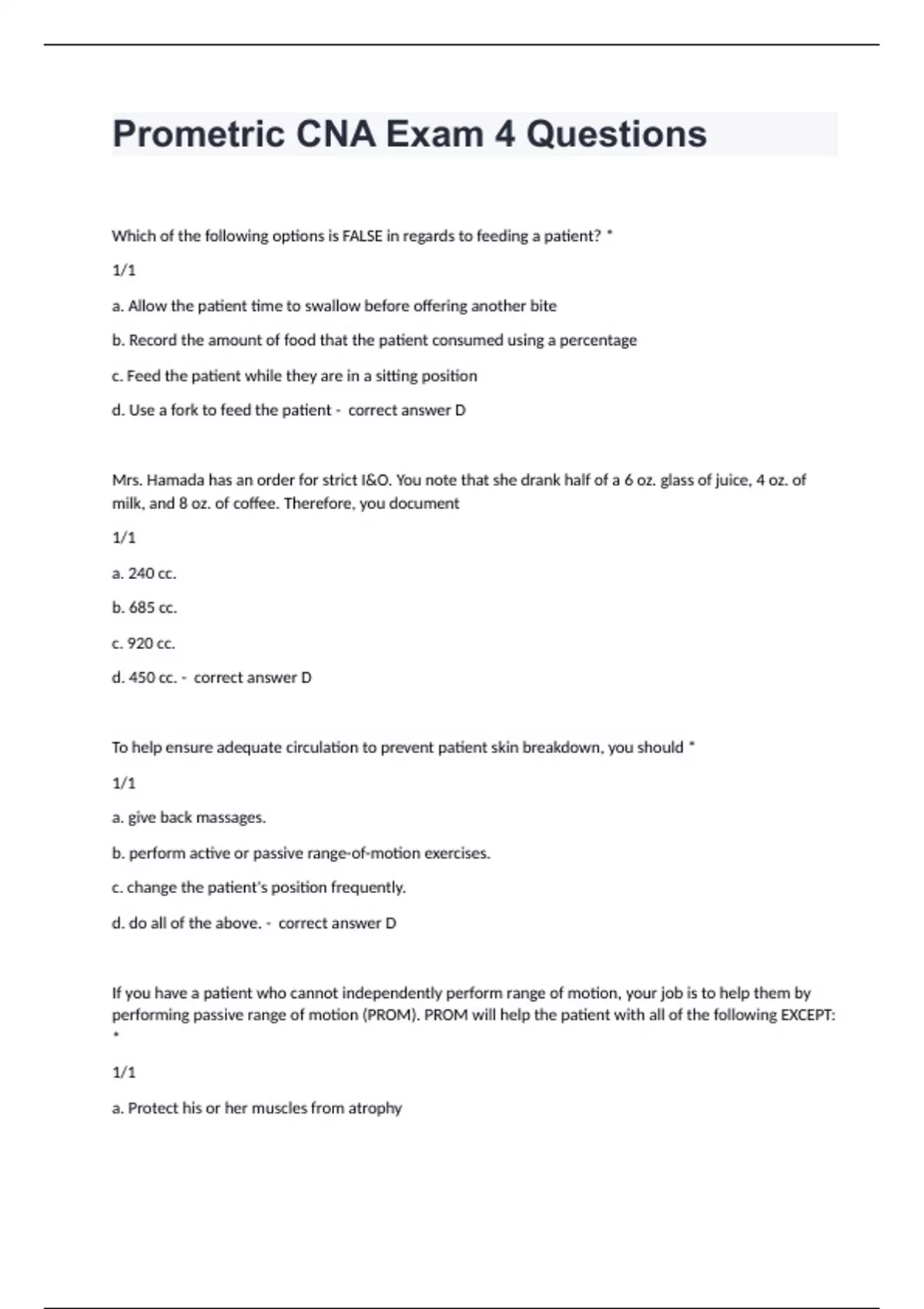 Prometric CNA Exam 4 QuestionsWhich of the following options is FALSE in regards to feeding a patient? * 1/1 a. Allow the patient time to swallow before offering another bite b. Record the amount of food that the patient consumed using a percentage c. Feed the patient while they are in a sitting position d. Use a fork to feed the patient - correct answer D Mrs. Hamada has an order for strict I&O. You note that she drank half of a 6 oz. glass of juice, 4 oz. of milk, and 8 oz. of coffee. Therefore, you document 1/1 a. 240 cc. b. 685 cc. c. 920 cc. d. 450 cc. - correct answer D To help ensure adequate circulation to prevent patient skin breakdown, you should * 1/1 a. give back massages. b. perform active or passive range-of-motion exercises. c. change the patient's position frequently. d. do all of the above. - correct answer D If you have a patient who cannot independently perform range of motion, your job is to help them by performing passive range of motion (PROM). PROM will help the patient with all of the following EXCEPT: * 1/1 a. Protect his or her muscles from atrophy