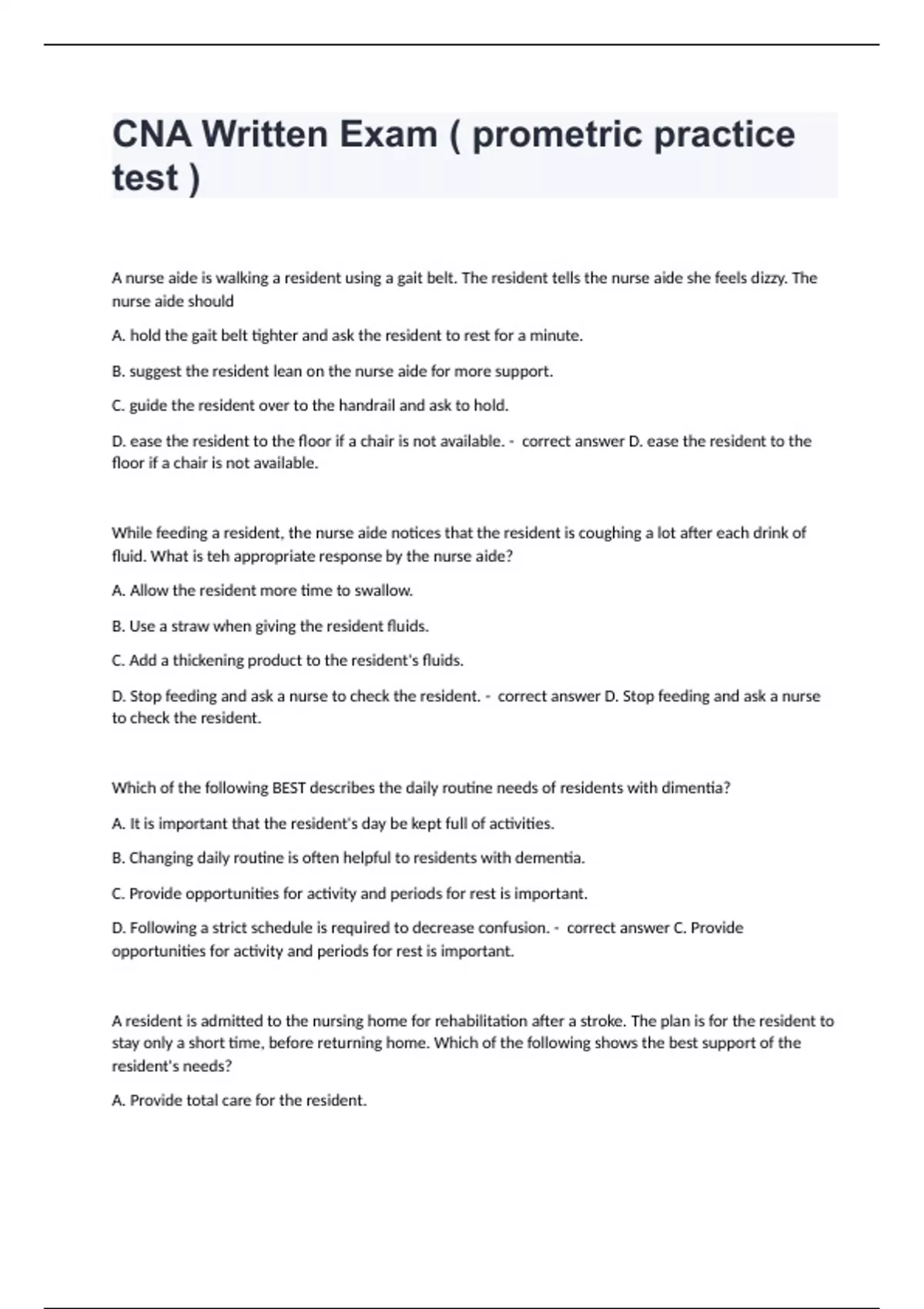 CNA Written Exam ( prometric practice test ) A nurse aide is walking a resident using a gait belt. The resident tells the nurse aide she feels dizzy. The nurse aide should A. hold the gait belt tighter and ask the resident to rest for a minute. B. suggest the resident lean on the nurse aide for more support. C. guide the resident over to the handrail and ask to hold. D. ease the resident to the floor if a chair is not available. - correct answer D. ease the resident to the floor if a chair is not available. While feeding a resident, the nurse aide notices that the resident is coughing a lot after each drink of fluid. What is teh appropriate response by the nurse aide? A. Allow the resident more time to swallow. B. Use a straw when giving the resident fluids. C. Add a thickening product to the resident's fluids. D. Stop feeding and ask a nurse to check the resident. - correct answer D. Stop feeding and ask a nurse to check the resident. Which of the following BEST describes the daily routine needs of residents with dimentia? A. It is important that the resident's day be kept full of activities. B. Changing daily routine is often helpful to residents with dementia. C. Provide opportunities for activity and periods for rest is important. D. Following a strict schedule is required to decrease confusion. - correct answer C. Provide opportunities for activity and periods for rest is important. A resident is admitted to the nursing home for rehabilitation after a stroke. The plan is for the resident to stay only a short time, before returning home. Which of the following shows the best support of the resident's needs? A. Provide total care for the resident.