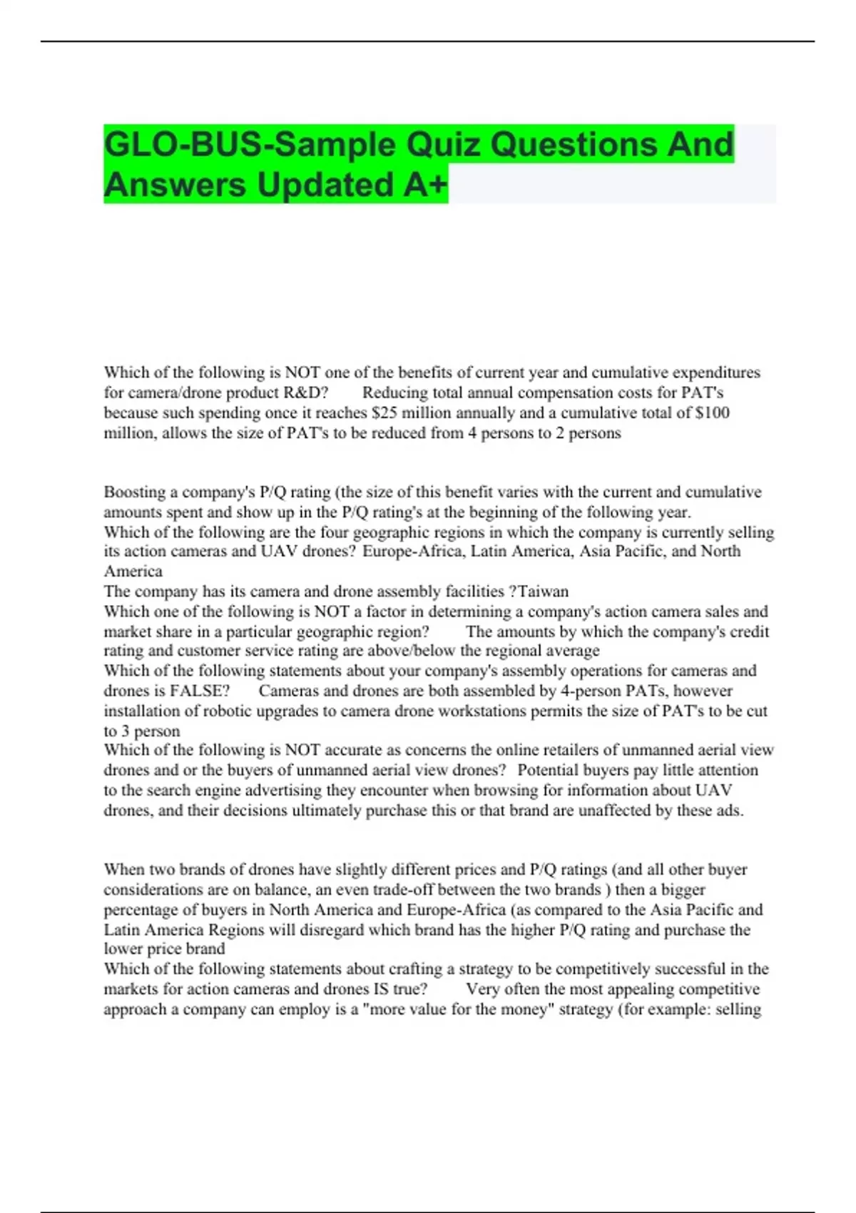GLO-BUS-Sample Quiz Questions And Answers Updated A+ Which of the following is NOT one of the benefits of current year and cumulative expenditures for camera/drone product R&D? Reducing total annual compensation costs for PAT's because such spending once it reaches $25 million annually and a cumulative total of $100 million, allows the size of PAT's to be reduced from 4 persons to 2 persons Boosting a company's P/Q rating (the size of this benefit varies with the current and cumulative amounts spent and show up in the P/Q rating's at the beginning of the following year. Which of the following are the four geographic regions in which the company is currently selling its action cameras and UAV drones? Europe-Africa, Latin America, Asia Pacific, and North America The company has its camera and drone assembly facilities ? Taiwan Which one of the following is NOT a factor in determining a company's action camera sales and market share in a particular geographic region? The amounts by which the company's credit rating and customer service rating are above/below the regional average Which of the following statements about your company's assembly operations for cameras and drones is FALSE? Cameras and drones are both assembled by 4-person PATs, however installation of robotic upgrades to camera drone workstations permits the size of PAT's to be cut to 3 person Which of the following is NOT accurate as concerns the online retailers of unmanned aerial view drones and or the buyers of unmanned aerial view drones? Potential buyers pay little attention to the search engine advertising they encounter when browsing for information about UAV drones, and their decisions ultimately purchase this or that brand are unaffected by these ads. When two brands of drones have slightly different prices and P/Q ratings (and all other buyer considerations are on balance, an even trade-off between the two brands ) then a bigger percentage of buyers in North America and Europe-Africa (as compared to the Asia Pacific and Latin America Regions will disregard which brand has the higher P/Q rating and purchase the lower price brand Which of the following statements about crafting a strategy to be competitively successful in the markets for action cameras and drones IS true? Very often the most appealing competitive approach a company can employ is a "more value for the money" strategy (for example: selling 8-star cameras and drones at lower prices than other 8-star brands) where your competitive advantage is an ability to incorporate "upscale" product attributes with high buyer appeal at lower costs than rivals and thereby underprice rival brands of cameras and drones having comparable attributes and P/Q ratings Which of the following statements does NOT accurately describe how your company's performance is scored on the Best-in Industry standard? If EPS gives an instructor-assigned weight of 20 points, a company with an industry leading EPS performance of $5.00 (that is above investor -expected EPS of $3.70) gets a score of 20 points and a company with EPS of $3.00 (Which is 60% as good as they leader's of $5.00) gets a score of 12 points (60% of 20 points) If image Rating is given a weight of 20 points by your instructor, a company with an industry-leading Image Rating of 80 (10 points above the investor expected rating of at least 70) earns a score of 20 points. If ROE is given a weight of 20 points by your instructor a company with an industry-leading ROE performance of 30% that happens to be 5% points above the investor expected ROE at 25% earns a score of 20 points plus 5 point bonus for achieving an ROE that is five percentage points above the investor expected ROE The factors that affect the productivity of Camera PAT's and drone PAT's include? How the total compensation packages (not including overtime pay) of camera/drone PAT members compare to the all-company average compensation levels and the amount a company spends annually per camera/drone PAT on training and productivity-enhancing assembly methods the size of assembly quality incentives paid to camera/drone PATs, how favorably the overall size of the company's total compensation package (not including overtime pay) per camera/drone PAT member compares against the camera/drone all-company averages, and changes in the number of camera/drone models that have to be assembled. The factors that affect a company's P/Q Rating include? The caliber of core components, a company's cumulative spending for new product R&D, engineering and design, the number of models, camera body ergonomics/durability and the number of special utility features Which of the following does NOT have a bearing in determining a company's action camera sales and market share in a particular geographic region? The P/Q ratings of the various brands of UAV drones offered for sale in the region The factors that affect the p/Q rating of a company's action cameras does NOT include? The color and weight of camera body The factors that affect a company's P/Q rating for UAV drones do NOT include? A company's cumulative spending on product advertisement Which of the following is NOT accurate as it concerns the retailers and buyers of action capture cameras? People interested in purchasing a wearable action camera to record videos of their activities do not research to educate themselves about features, performance, and prices of the various brands and models. Which of the following are three factors used to determine a company's credit rating? its