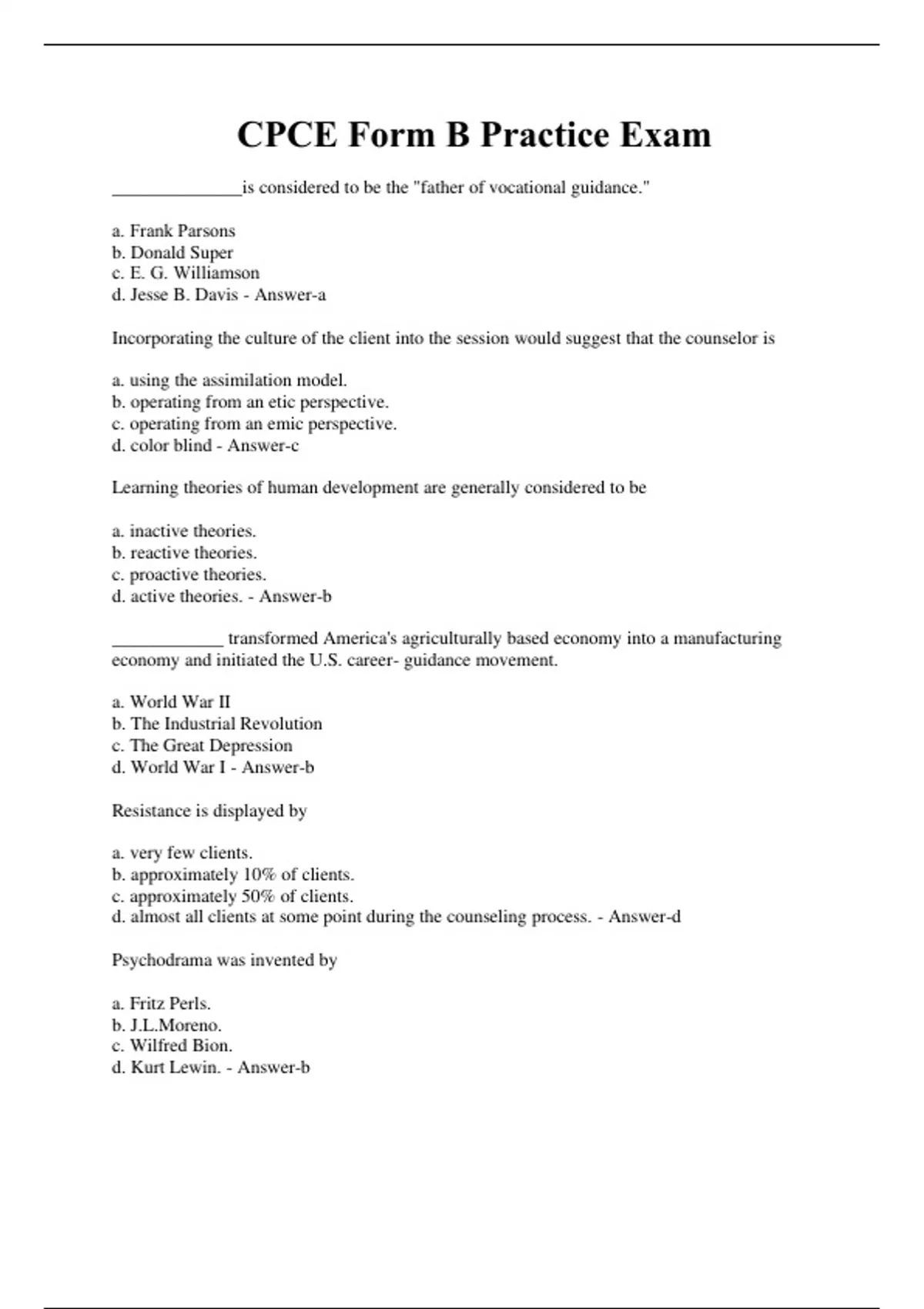 ______________is considered to be the "father of vocational guidance." а. Frank Parsons b. Donald Super с. E. G. Williamson d. Jesse B. Davis - Answer-a Incorporating the culture of the client into the session would suggest that the counselor is a. using the assimilation model. b. operating from an etic perspective. c. operating from an emic perspective. d. color blind - Answer-c Learning theories of human development are generally considered to be a. inactive theories. b. reactive theories. c. proactive theories. d. active theories. - Answer-b ____________ transformed America's agriculturally based economy into a manufacturing economy and initiated the U.S. career- guidance movement. a. World War II b. The Industrial Revolution c. The Great Depression d. World War I - Answer-b Resistance is displayed by a. very few clients. b. approximately 10% of clients. c. approximately 50% of clients. d. almost all clients at some point during the counseling process. - Answer-d Psychodrama was invented by a. Fritz Perls. b. J.L.Moreno. c. Wilfred Bion. d. Kurt Lewin. - Answer-b