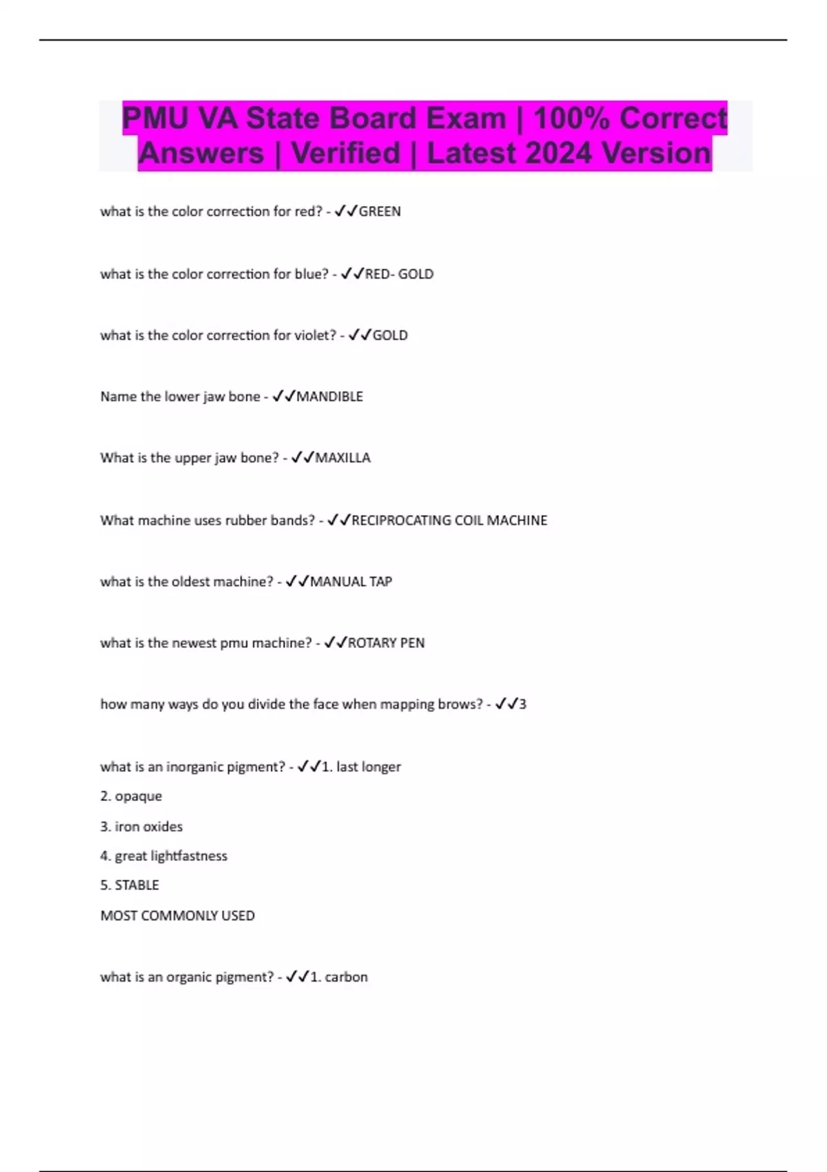 what is the color correction for red? - GREEN what is the color correction for blue? - RED- GOLD what is the color correction for violet? - GOLD Name the lower jaw bone - MANDIBLE What is the upper jaw bone? - MAXILLA What machine uses rubber bands? - RECIPROCATING COIL MACHINE what is the oldest machine? - MANUAL TAP what is the newest pmu machine? - ROTARY PEN how many ways do you divide the face when mapping brows? - 3 what is an inorganic pigment? - 1. last longer