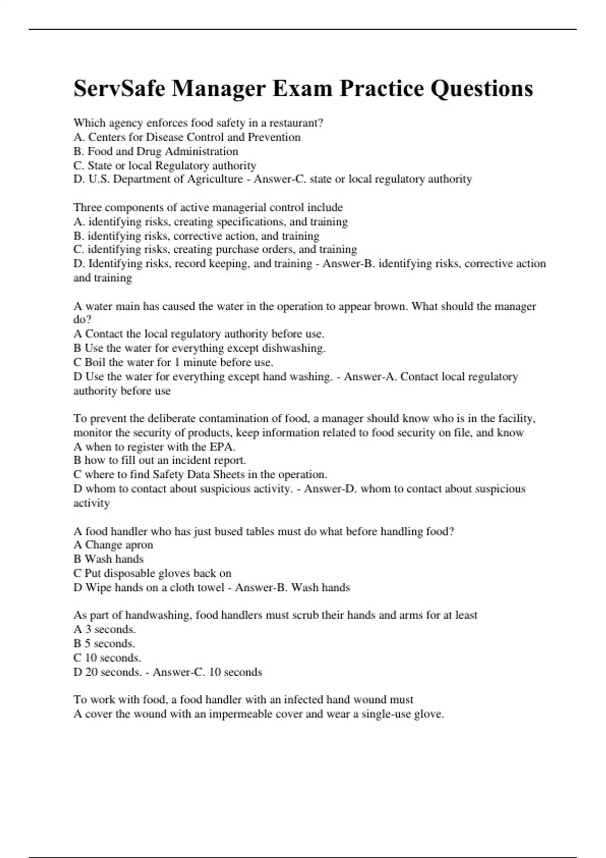 Which agency enforces food safety in a restaurant? A. Centers for Disease Control and Prevention B. Food and Drug Administration C. State or local Regulatory authority D. U.S. Department of Agriculture - Answer-C. state or local regulatory authority Three components of active managerial control include A. identifying risks, creating specifications, and training B. identifying risks, corrective action, and training C. identifying risks, creating purchase orders, and training D. Identifying risks, record keeping, and training - Answer-B. identifying risks, corrective action and training A water main has caused the water in the operation to appear brown. What should the manager do? A Contact the local regulatory authority before use. B Use the water for everything except dishwashing. C Boil the water for 1 minute before use. D Use the water for everything except hand washing. - Answer-A. Contact local regulatory authority before use To prevent the deliberate contamination of food, a manager should know who is in the facility, monitor the security of products, keep information related to food security on file, and know A when to register with the EPA. B how to fill out an incident report. C where to find Safety Data Sheets in the operation. D whom to contact about suspicious activity. - Answer-D. whom to contact about suspicious activity A food handler who has just bused tables must do what before handling food? A Change apron B Wash hands C Put disposable gloves back on D Wipe hands on a cloth towel - Answer-B. Wash hands As part of handwashing, food handlers must scrub their hands and arms for at least A 3 seconds. B 5 seconds. C 10 seconds. D 20 seconds. - Answer-C. 10 seconds To work with food, a food handler with an infected hand wound must A cover the wound with an impermeable cover and wear a single-use glove.