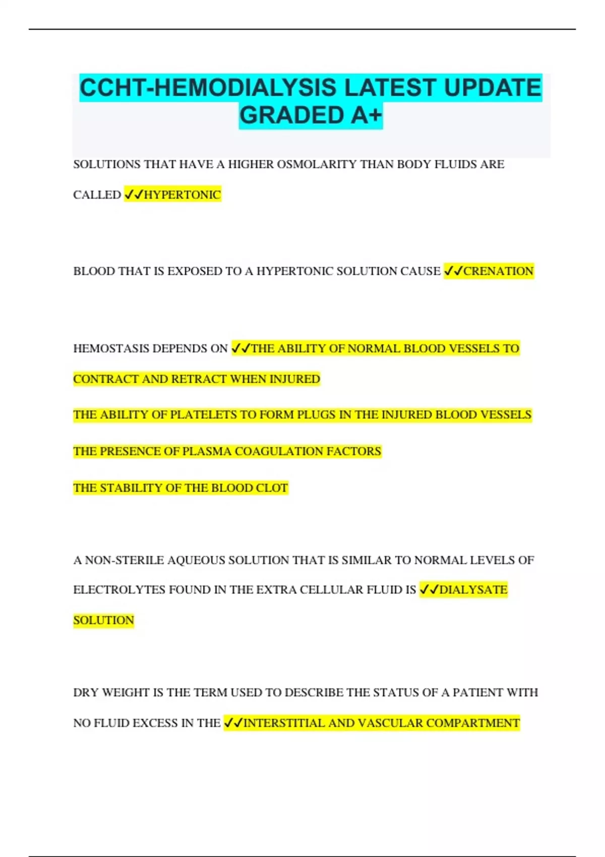 CCHT-HEMODIALYSIS LATEST UPDATE GRADED A+ SOLUTIONS THAT HAVE A HIGHER OSMOLARITY THAN BODY FLUIDS ARE CALLED HYPERTONIC BLOOD THAT IS EXPOSED TO A HYPERTONIC SOLUTION CAUSE CRENATION HEMOSTASIS DEPENDS ON THE ABILITY OF NORMAL BLOOD VESSELS TO CONTRACT AND RETRACT WHEN INJURED THE ABILITY OF PLATELETS TO FORM PLUGS IN THE INJURED BLOOD VESSELS THE PRESENCE OF PLASMA COAGULATION FACTORS THE STABILITY OF THE BLOOD CLOT A NON-STERILE AQUEOUS SOLUTION THAT IS SIMILAR TO NORMAL LEVELS OF ELECTROLYTES FOUND IN THE EXTRA CELLULAR FLUID IS DIALYSATE SOLUTION DRY WEIGHT IS THE TERM USED TO DESCRIBE THE STATUS OF A PATIENT WITH NO FLUID EXCESS IN THE INTERSTITIAL AND VASCULAR COMPARTMENT THE PRINCIPLE UNDERLYING WASTE PRODUCT REMOVAL IN HEMODIALYSIS IS DIFFUSION THE MOVEMENT OF SOLUTE PARTICLES FROM AN AREA OF HIGHER CHEMICAL CONCENTRATION TO AN AREA OF LOWER CHEMICAL CONCENTRATION UNITL EQUILIBRIUM IS REACHED IS CALLED DIFFUSION BLOOD AND DIALYZING FLUID FLOWING IN OPPOSITE DIRECTIONS IS CALLED COUNTER-CURRENT FLOW FACTORS WHICH INFLUENCE DIALYZER CLEARANCE INCLUDE BLOOD FLOW RATE DIALYSATE FLOW RATE MEMBRANE PERMEABILITY WHICH OF THE FOLLOWING IS NECESSARY FOR HIGH FLUX DIALYSIS ULTRA FILTRATION CONTROL IN A ROLLER-TYPE PUMP, THE PRESSURE OF THE ROLLERS AGAINST THE TUBING IS CALLED OCCLUSION THE PRACTITIONER ATTACHES AN AIR/FOAM DETECTOR IN ORDER OT DETECT THE PRESENCE OF AIR IN THE VENOUS BLOOD LINE PRE-PUMP ARTERIAL PRESSURE SHOULD BE MEASURED, PARTICULARLY WITH HIGH BLOOD FLOW RATES BECAUSE HEMOLYSIS MAY OCCUR WITH VERY LOW (MORE NEGATIVE) UNDETECTED NEGATIVE PRESSURES PRE-PUMP ARTERIAL PRESSURE IN A PATIENT WITH A FISTULA SHOULD BE BELOW ZERO (NEGATIVE) HAVE THE UPPER ALARM LIMIT SET BELOW ZERO SEQUENTIAL ULTRAFILTRATION IS BEST DESCRIBED AS FLUID REMOVAL WITHOUT DIFFUSION DIALYSIS