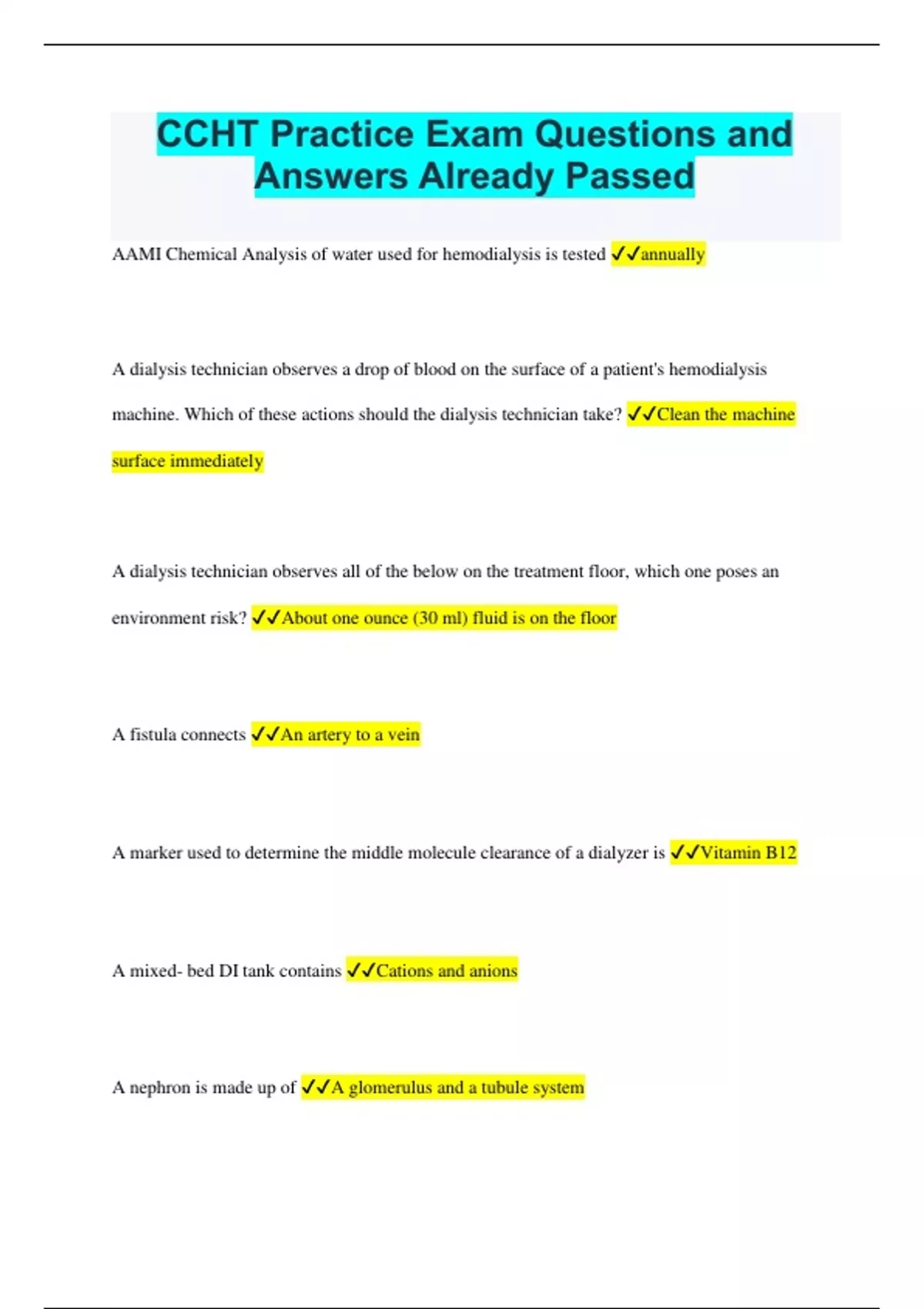 CCHT Practice Exam Questions and Answers Already Passed AAMI Chemical Analysis of water used for hemodialysis is tested annually A dialysis technician observes a drop of blood on the surface of a patient's hemodialysis machine. Which of these actions should the dialysis technician take? Clean the machine surface immediately A dialysis technician observes all of the below on the treatment floor, which one poses an environment risk? About one ounce (30 ml) fluid is on the floor A fistula connects An artery to a vein A marker used to determine the middle molecule clearance of a dialyzer is Vitamin B12 A mixed- bed DI tank contains Cations and anions A nephron is made up of A glomerulus and a tubule system A patient complains of pain at the venous needle site. The dialysis technician observes there is swelling distal to the venous needle site and that the venous pressure is rising. The dialysis technician should suspect An infiltration A patient who is to receive their first dialysis treatment is prone to? Dialysis Disequilibrium Syndrome A patient tells the technician that the dietician reviewed high potassium foods with her. During the conversation she states she routinely eats the following foods. Which one is highest in potassium? bananas A reason why a dialysis technician is to be certified is It's a new Federal regulation A rise in transmembrane pressure in a low flux dialyzer during hemodialysis is indicative of Clotting of extracorporeal circuit A teammate asks you to document the normal saline he just gave to Mr. Smith. You would: Never document something that someone else did A true aneurysm can be dangerous because it May rupture and cause the patient to bleed profusely A patient's laboratory results indicate that the predialysis BUN level was lower than the post dialysis BUN level. When interpreting these findings the technician should seek the answer to which of these questions? Was the predialysis sample drawn from the venous port? A rapid pulse of 104 beats/minute would indicate that the patient has: Tachycardia A patient's dry weight is 154.0 (70kg) and the patient's pre treatment weight is 158.4. (72kg). For a four- hour treatment, how many mL/ hour must