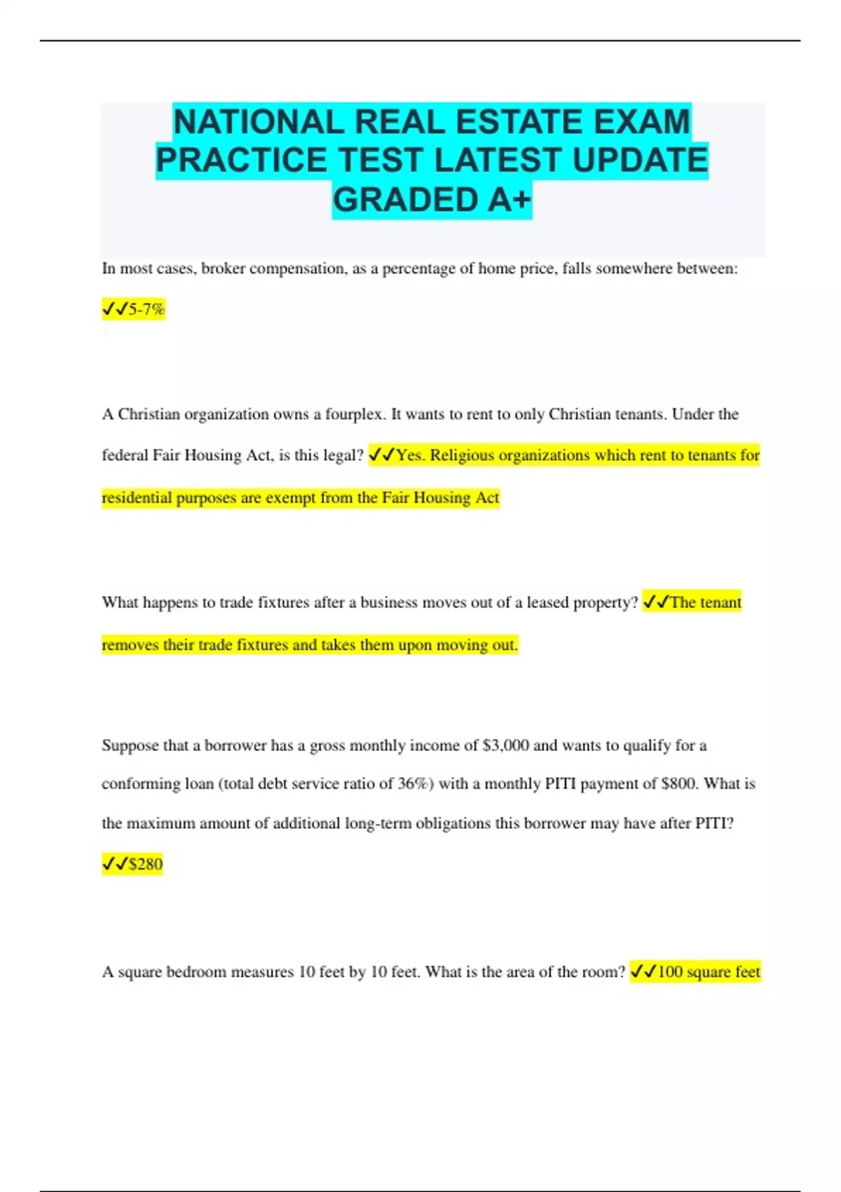 NATIONAL REAL ESTATE EXAM PRACTICE TEST LATEST UPDATE GRADED A+ In most cases, broker compensation, as a percentage of home price, falls somewhere between: 5-7% A Christian organization owns a fourplex. It wants to rent to only Christian tenants. Under the federal Fair Housing Act, is this legal? Yes. Religious organizations which rent to tenants for residential purposes are exempt from the Fair Housing Act What happens to trade fixtures after a business moves out of a leased property? The tenant removes their trade fixtures and takes them upon moving out. Suppose that a borrower has a gross monthly income of $3,000 and wants to qualify for a conforming loan (total debt service ratio of 36%) with a monthly PITI payment of $800. What is the maximum amount of additional long-term obligations this borrower may have after PITI? $280 A square bedroom measures 10 feet by 10 feet. What is the area of the room? 100 square feet Which of these is an economic characteristic that makes land a distinctive commodity?* situs In a fixed-rate mortgage that is fully amortized, the total amount of interest to be paid is: predetermined Which is exempt from the federal Fair Housing Act? renting a room in a house occupied by the owner The Americans with Disabilities Act applies to: privately owned or government-owned public accommodations Condemnation is the act of seizing private property from citizens. What gives the government the right to do this? eminent domain The PHYSICAL characteristics of land are that land is indestructible, non-homogenous, and: immobile Which statement BEST defines the term contingency? stipulation that must be satisfied before the contract can be performed If a borrower is behind on payments, the acceleration clause gives the lender the ability to: call the entire loan balance due immediately A metes and bounds legal description always returns to: the point of beginning What should a license holder do if a client instructs them to do something that would discriminate against a protected class? advise the client they cannot legally discriminate against certain groups What is a novation? the substitution of one contract for another A married couple bought a home ten years ago for $400,000. Their neighborhood has rapidly grown in popularity, and they were able to sell their home this year for $950,000. How much of that money will they be required to pay capital gains tax on? $50,000 Which element of a valid contract states that the contract cannot require any illegal activities or outcomes? lawful objective Deanna wants to sue her real estate agent, but finds out that she has no legal recourse because too many years have passed since the offending incident. What is this an example of? statute of limitations Pedro bought his house for $370,000. The assessed value is $290,000. If the tax rate for Pedro's county is 2.375%, what will he pay in ad valorem taxes this year? $6,887.50 A potentially valid contract in which at least one party has the option to rescind is described as: voidable When you're talking about mortgages, what is another name for an origination fee? points Both parties involved in an agency agreement agree to end the agreement early. What is this called? mutual rescission