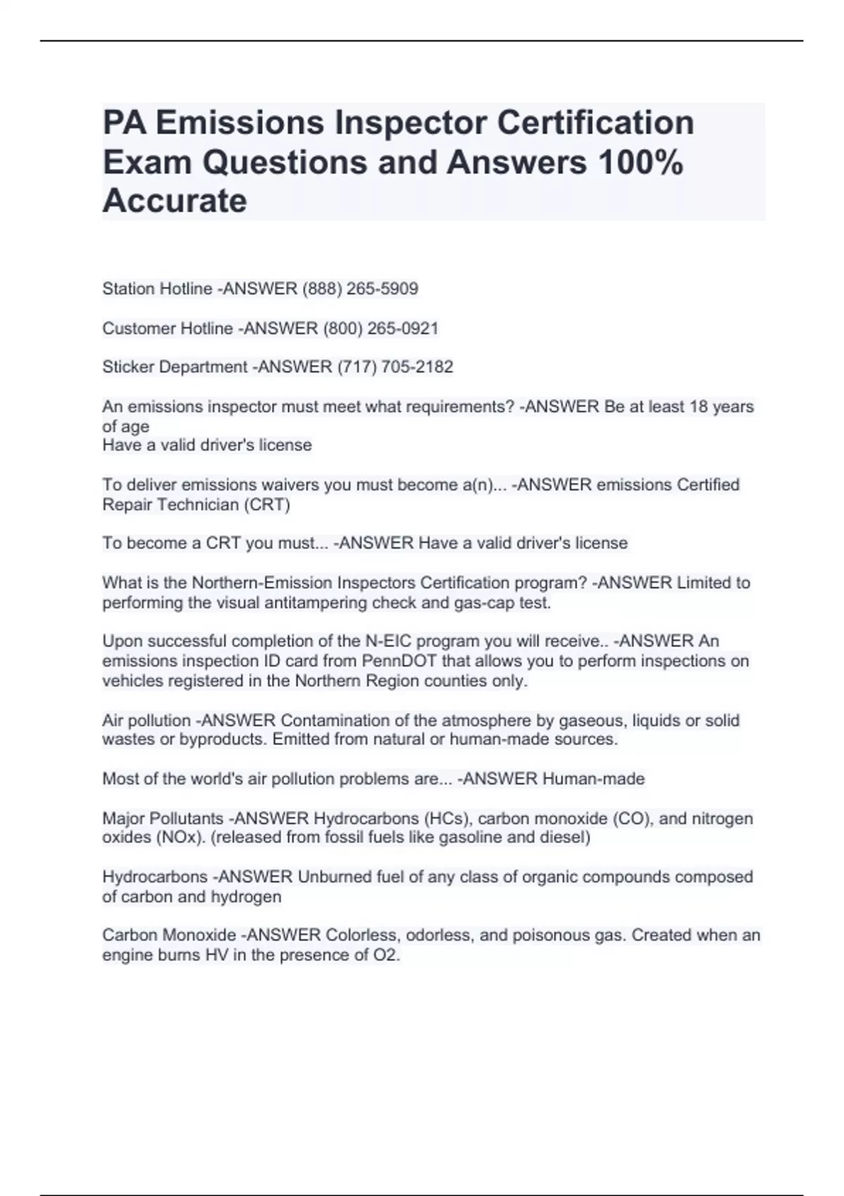 PA Emissions Inspector Certification Exam Questions and Answers 100% Accurate PA Emissions Inspector Certification Exam Questions and Answers 100% Accurate PA Emissions Inspector Certification Exam Questions and Answers 100% Accurate PA Emissions Inspector Certification Exam Questions and Answers 100% Accurate Station Hotline -ANSWER (888) 265-5909 Customer Hotline -ANSWER (800) 265-0921 Sticker Department -ANSWER (717) 705-2182
