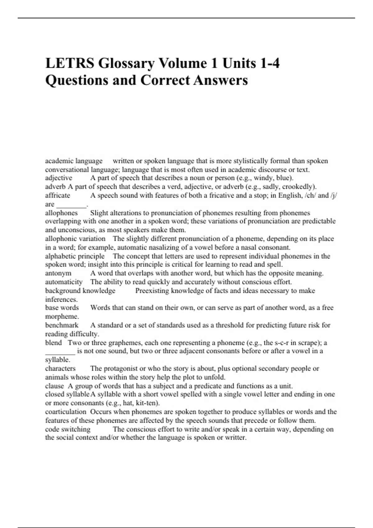 LETRS Glossary Volume 1 Units 1-4 Questions and Correct Answers academic language written or spoken language that is more stylistically formal than spoken conversational language; language that is most often used in academic discourse or text. adjective A part of speech that describes a noun or person (e.g., windy, blue). adverb A part of speech that describes a verd, adjective, or adverb (e.g., sadly, crookedly). affricate A speech sound with features of both a fricative and a stop; in English, /ch/ and /j/ are ________. allophones Slight alterations to pronunciation of phonemes resulting from phonemes overlapping with one another in a spoken word; these variations of pronunciation are predictable and unconscious, as most speakers make them. allophonic variation The slightly different pronunciation of a phoneme, depending on its place in a word; for example, automatic nasalizing of a vowel before a nasal consonant. alphabetic principle The concept that letters are used to represent individual phonemes in the spoken word; insight into this principle is critical for learning to read and spell. antonym A word that overlaps with another word, but which has the opposite meaning. automaticity The ability to read quickly and accurately without conscious effort. background knowledge Preexisting knowledge of facts and ideas necessary to make inferences. base words Words that can stand on their own, or can serve as part of another word, as a free morpheme. benchmark A standard or a set of standards used as a threshold for predicting future risk for reading difficulty. blend Two or three graphemes, each one representing a phoneme (e.g., the s-c-r in scrape); a ________ is not one sound, but two or three adjacent consonants before or after a vowel in a syllable. characters The protagonist or who the story is about, plus optional secondary people or animals whose roles within the story help the plot to unfold. clause A group of words that has a subject and a predicate and functions as a unit. closed syllable A syllable with a short vowel spelled with a single vowel letter and ending in one or more consonants (e.g., hat, kit-ten). coarticulation Occurs when phonemes are spoken together to produce syllables or words and the features of these phonemes are affected by the speech sounds that precede or follow them. code switching The conscious effort to write and/or speak in a certain way, depending on the social context and/or whether the language is spoken or writter.