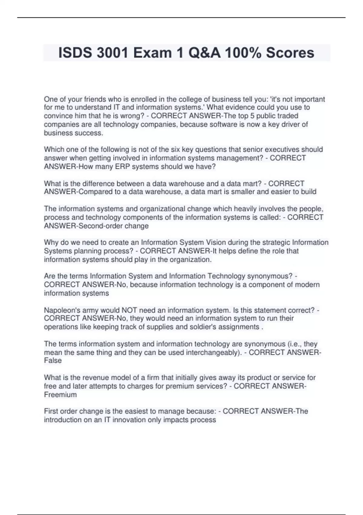 ISDS 3001 Exam 1 Q&A 100% Scores One of your friends who is enrolled in the college of business tell you: 'it's not important for me to understand IT and information systems.' What evidence could you use to convince him that he is wrong? - CORRECT ANSWER-The top 5 public traded companies are all technology companies, because software is now a key driver of business success. Which one of the following is not of the six key questions that senior executives should answer when getting involved in information systems management? - CORRECT ANSWER-How many ERP systems should we have? What is the difference between a data warehouse and a data mart? - CORRECT ANSWER-Compared to a data warehouse, a data mart is smaller and easier to build The information systems and organizational change which heavily involves the people, process and technology components of the information systems is called: - CORRECT ANSWER-Second-order change Why do we need to create an Information System Vision during the strategic Information Systems planning process? - CORRECT ANSWER-It helps define the role that information systems should play in the organization. Are the terms Information System and Information Technology synonymous? - CORRECT ANSWER-No, because information technology is a component of modern information systems Napoleon's army would NOT need an information system. Is this statement correct? - CORRECT ANSWER-No, they would need an information system to run their operations like keeping track of supplies and soldier's assignments . The terms information system and information technology are synonymous (i.e., they mean the same thing and they can be used interchangeably). - CORRECT ANSWERFalse What is the revenue model of a firm that initially gives away its product or service for free and later attempts to charges for premium services? - CORRECT ANSWERFreemium First order change is the easiest to manage because: - CORRECT ANSWER-The introduction on an IT innovation only impacts process