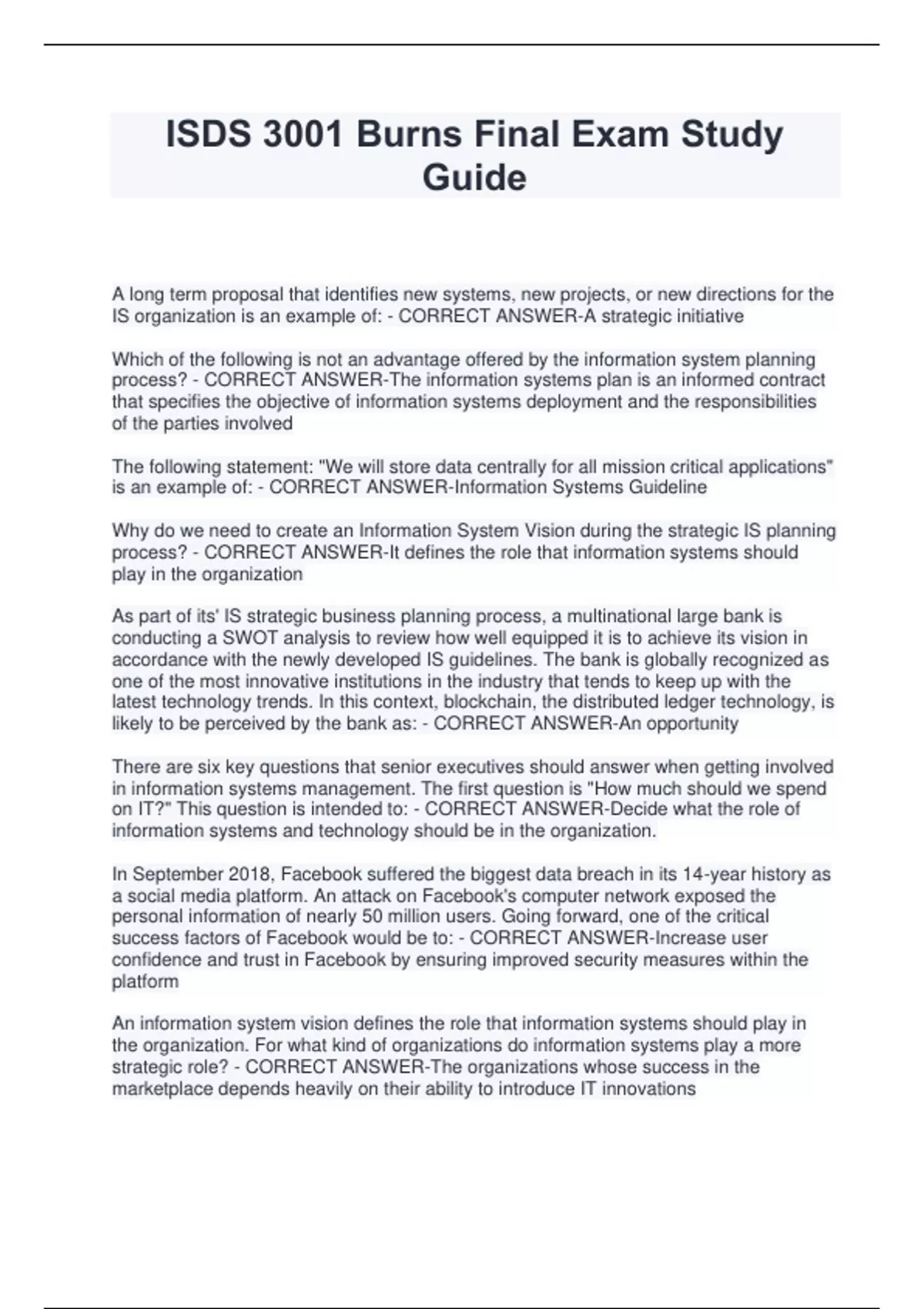 ISDS 3001 Burns Final Exam Study Guide A long term proposal that identifies new systems, new projects, or new directions for the IS organization is an example of: - CORRECT ANSWER-A strategic initiative Which of the following is not an advantage offered by the information system planning process? - CORRECT ANSWER-The information systems plan is an informed contract that specifies the objective of information systems deployment and the responsibilities of the parties involved The following statement: "We will store data centrally for all mission critical applications" is an example of: - CORRECT ANSWER-Information Systems Guideline Why do we need to create an Information System Vision during the strategic IS planning process? - CORRECT ANSWER-It defines the role that information systems should play in the organization As part of its' IS strategic business planning process, a multinational large bank is conducting a SWOT analysis to review how well equipped it is to achieve its vision in accordance with the newly developed IS guidelines. The bank is globally recognized as one of the most innovative institutions in the industry that tends to keep up with the latest technology trends. In this context, blockchain, the distributed ledger technology, is likely to be perceived by the bank as: - CORRECT ANSWER-An opportunity There are six key questions that senior executives should answer when getting involved in information systems management. The first question is "How much should we spend on IT?" This question is intended to: - CORRECT ANSWER-Decide what the role of information systems and technology should be in the organization. In September 2018, Facebook suffered the biggest data breach in its 14-year history as a social media platform. An attack on Facebook's computer network exposed the personal information of nearly 50 million users. Going forward, one of the critical success factors of Facebook would be to: - CORRECT ANSWER-Increase user confidence and trust in Facebook by ensuring improved security measures within the platform An information system vision defines the role that information systems should play in the organization. For what kind of organizations do information systems play a more strategic role? - CORRECT ANSWER-The organizations whose success in the marketplace depends heavily on their ability to introduce IT innovations