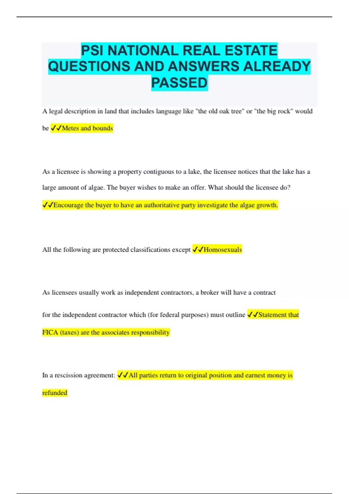 PSI NATIONAL REAL ESTATE QUESTIONS AND ANSWERS ALREADY PASSED