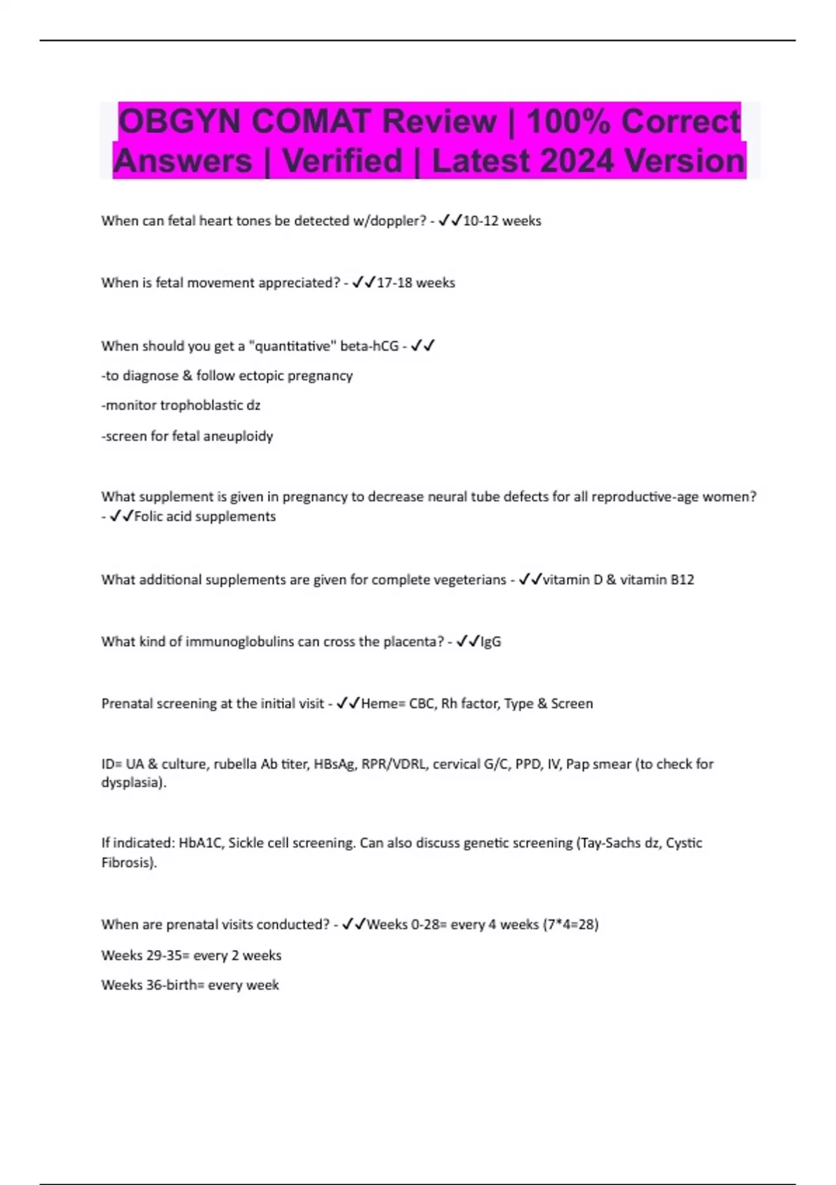 When can fetal heart tones be detected w/doppler? - 10-12 weeks When is fetal movement appreciated? - 17-18 weeks When should you get a "quantitative" beta-hCG - -to diagnose & follow ectopic pregnancy -monitor trophoblastic dz -screen for fetal aneuploidy What supplement is given in pregnancy to decrease neural tube defects for all reproductive-age women? - Folic acid supplements What additional supplements are given for complete vegeterians - vitamin D & vitamin B12 What kind of immunoglobulins can cross the placenta? - IgG Prenatal screening at the initial visit - Heme= CBC, Rh factor, Type & Screen ID= UA & culture, rubella Ab titer, HBsAg, RPR/VDRL, cervical G/C, PPD, IV, Pap smear (to check for dysplasia).