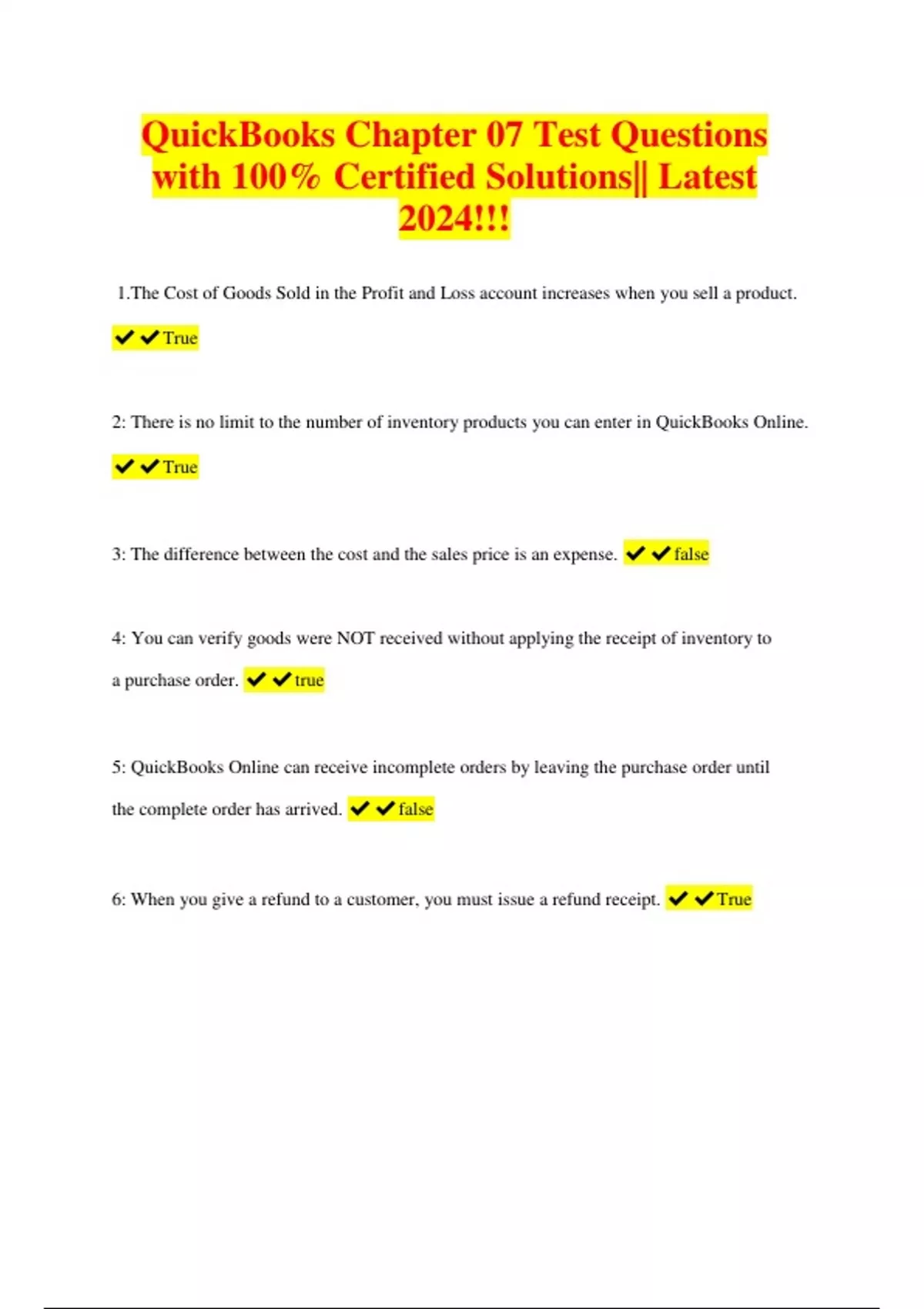 1.The Cost of Goods Sold in the Profit and Loss account increases when you sell a product. True 2: There is no limit to the number of inventory products you can enter in QuickBooks Online. True 3: The difference between the cost and the sales price is an expense. false 4: You can verify goods were NOT received without applying the receipt of inventory to a purchase order. true 5: QuickBooks Online can receive incomplete orders by leaving the purchase order until the complete order has arrived. false 6: When you give a refund to a customer, you must issue a refund receipt. True