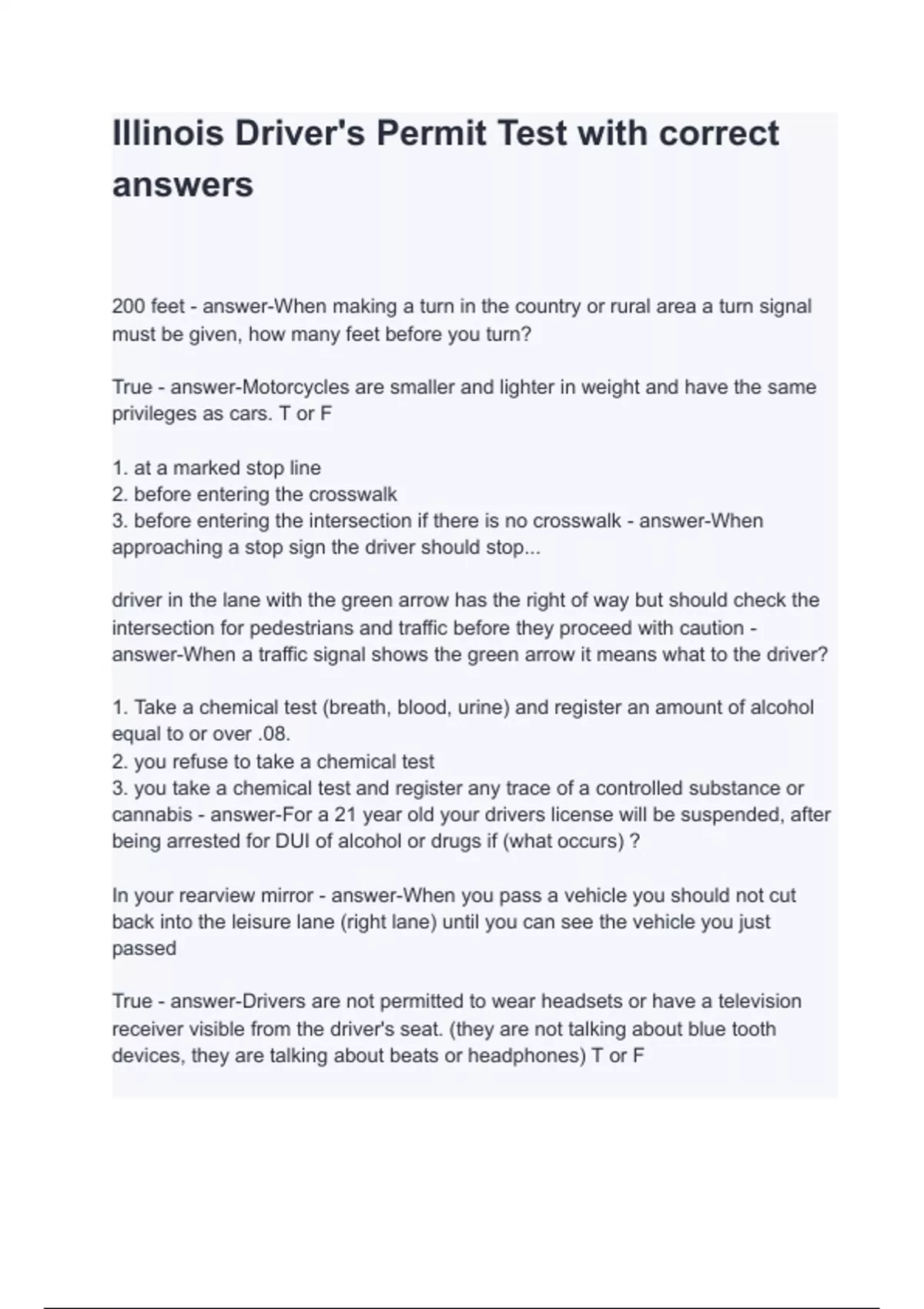 Illinois Driver's Permit Test with correct answers 200 feet - answer-When making a turn in the country or rural area a turn signal must be given, how many feet before you turn? True - answer-Motorcycles are smaller and lighter in weight and have the same privileges as cars. T or F 1. at a marked stop line 2. before entering the crosswalk 3. before entering the intersection if there is no crosswalk - answer-When approaching a stop sign the driver should stop... driver in the lane with the green arrow has the right of way but should check the intersection for pedestrians and traffic before they proceed with caution - answer-When a traffic signal shows the green arrow it means what to the driver? 1. Take a chemical test (breath, blood, urine) and register an amount of alcohol equal to or over .08. 2. you refuse to take a chemical test 3. you take a