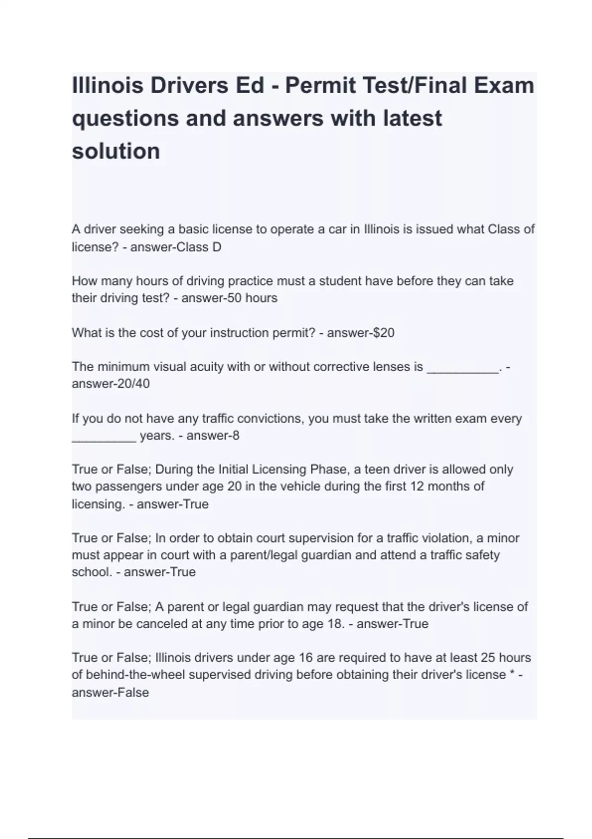 Illinois Drivers Ed - Permit Test/Final Exam questions and answers with latest solution A driver seeking a basic license to operate a car in Illinois is issued what Class of license? - answer-Class D How many hours of driving practice must a student have before they can take their driving test? - answer-50 hours What is the cost of your instruction permit? - answer-$20 The minimum visual acuity with or without corrective lenses is __________. - answer-20/40 If you do not have any traffic convictions, you must take the written exam every _________ years. - answer-8 True or False; During the Initial Licensing Phase, a teen driver is allowed only two passengers under age 20 in the vehicle during the first 12 months of licensing. - answer-True True or False; In