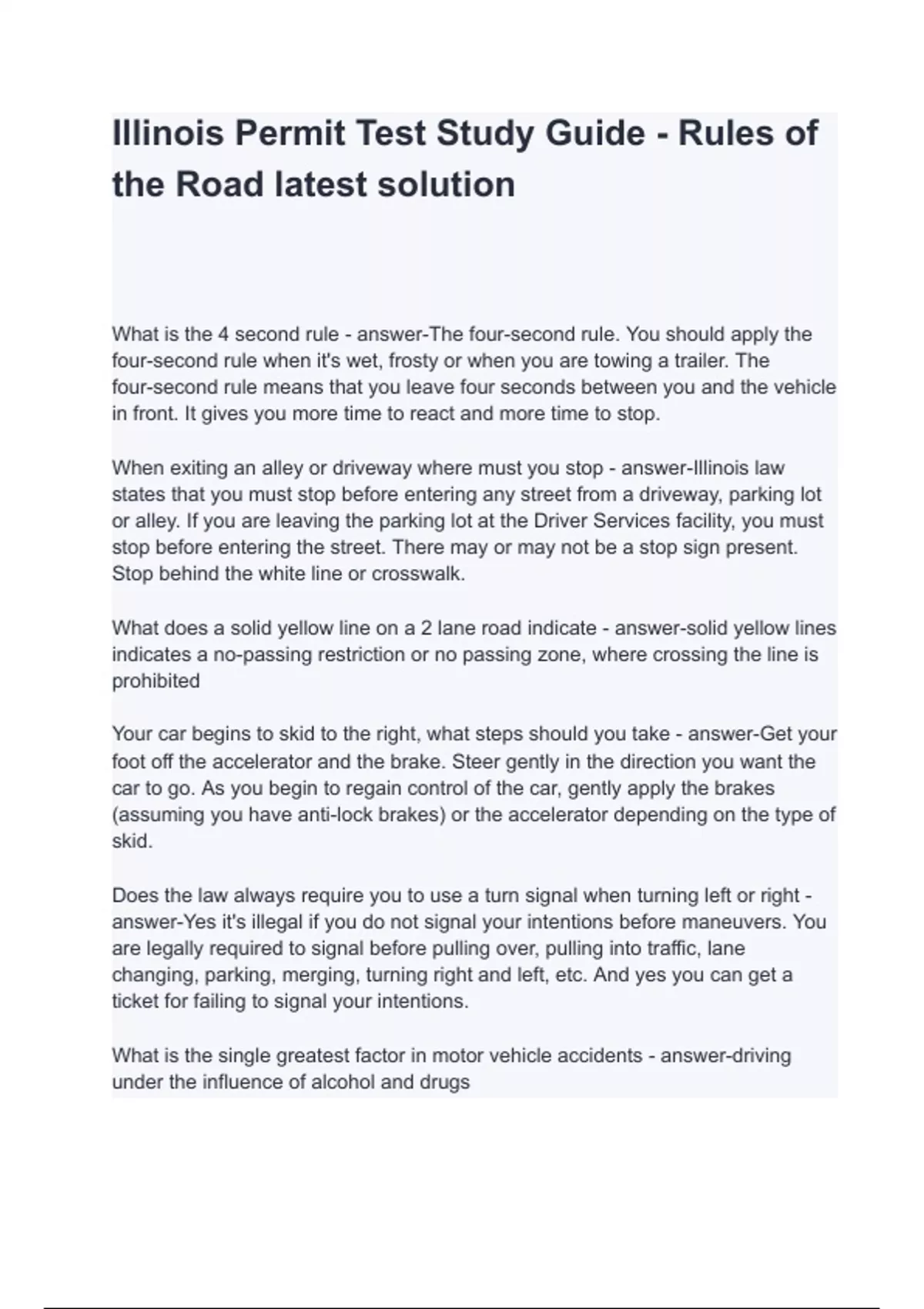 Illinois Permit Test Study Guide - Rules of the Road latest solution What is the 4 second rule - answer-The four-second rule. You should apply the four-second rule when it's wet, frosty or when you are towing a trailer. The four-second rule means that you leave four seconds between you and the vehicle in front. It gives you more time to react and more time to stop. When exiting an alley or driveway where must you stop - answer-Illinois law states that you must stop before entering any street from a driveway, parking lot or alley. If you are leaving the parking lot at the Driver Services facility, you must stop before entering the street. There may or may not be a stop sign present. Stop behind the white line or crosswalk. What does a solid yellow line on a 2 lane road indicate - answer-solid yellow lines indicates a no-passing restriction or no passing zone, where crossing the line is prohibited Your car begins to skid to the right, what steps should you take - answer-Get your foot off the accelerator and the brake. Steer gently in the direction you want the car to go. As you begin to regain control of the car, gently apply the brakes (assuming