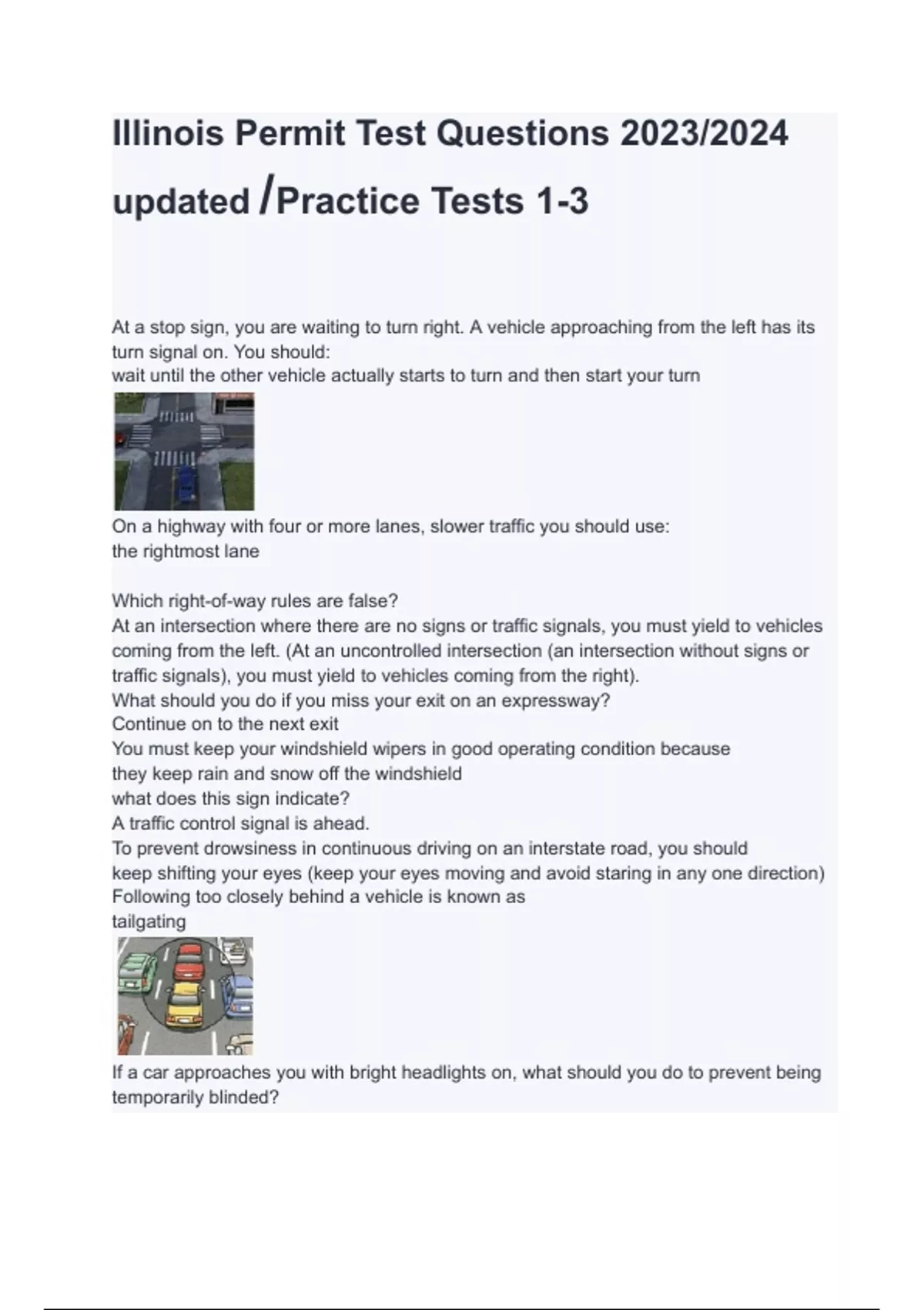 Illinois Permit Test Questions 2023/2024 updated /Practice Tests 1-3