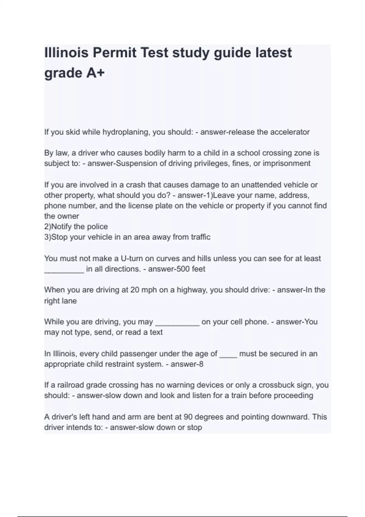 Illinois Permit Test study guide latest grade A+ If you skid while hydroplaning, you should: - answer-release the accelerator By law, a driver who causes bodily harm to a child in a school crossing zone is subject to: - answer-Suspension of driving privileges, fines, or imprisonment If you are involved in a crash that causes damage to an unattended vehicle or other property, what should you do? - answer-1)Leave your name, address, phone number, and the license plate on the vehicle or property if you cannot find the owner 2)Notify the police 3)Stop your vehicle in an area away from traffic You must not make a U-turn on curves and hills unless you can see for at least _________ in all directions. - answer-500 feet When you are driving at 20 mph on a highway, you should drive: - answer-In the right lane While you are driving, you may __________ on your cell phone. - answer-You may not type, send, or read a text In Illinois, ev