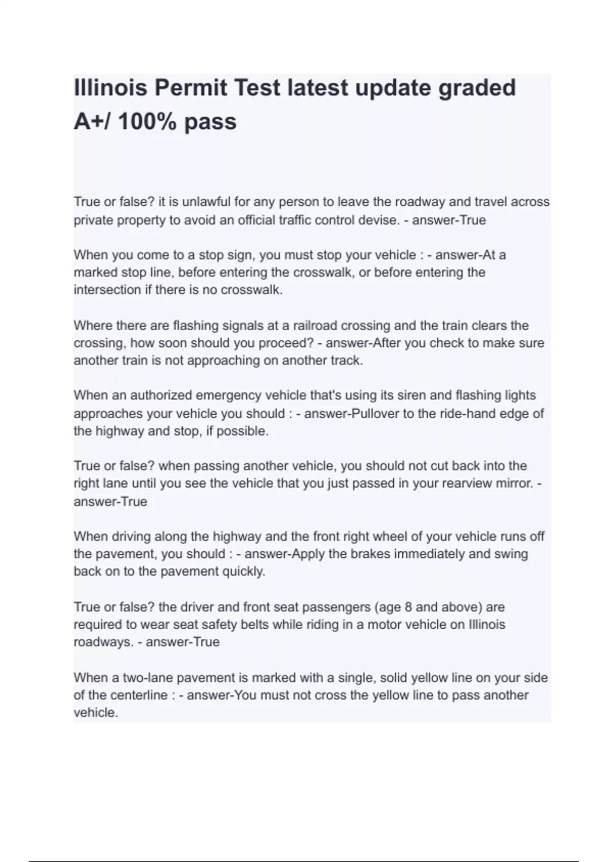 Illinois Permit Test latest update graded A+/ 100% pass True or false? it is unlawful for any person to leave the roadway and travel across private property to avoid an official traffic control devise. - answer-True When you come to a stop sign, you must stop your vehicle : - answer-At a marked stop line, before entering the crosswalk, or before entering the intersection if there is no crosswalk. Where there are flashing signals at a railroad crossing and the train clears the crossing, how soon should you proceed? - answer-After you check to make sure another train is not approaching on another track. When an authorized emergency vehicle that's using its siren and flashing lights approaches your vehicle you should : - answer-Pullover to the ride-hand edge of the highway and stop, if possible. True or false? when passing another vehicle, you should not cut back into the right lane until you see the vehicle that you just passed in your rearview mirror. - answer-True When driving along the highway and the front right wheel of your vehicle runs off the pavement, you should : - answer-Apply the brakes immediately and swing back on to the pavement quickly. True or false? the driver and front seat passengers (age 8 and above) are required to wear seat safety belts while riding in a motor vehicle on Illinois roadways. - answer-True When a two-lane pavement is marked with a single, solid yellow line on your side of the centerline : - a