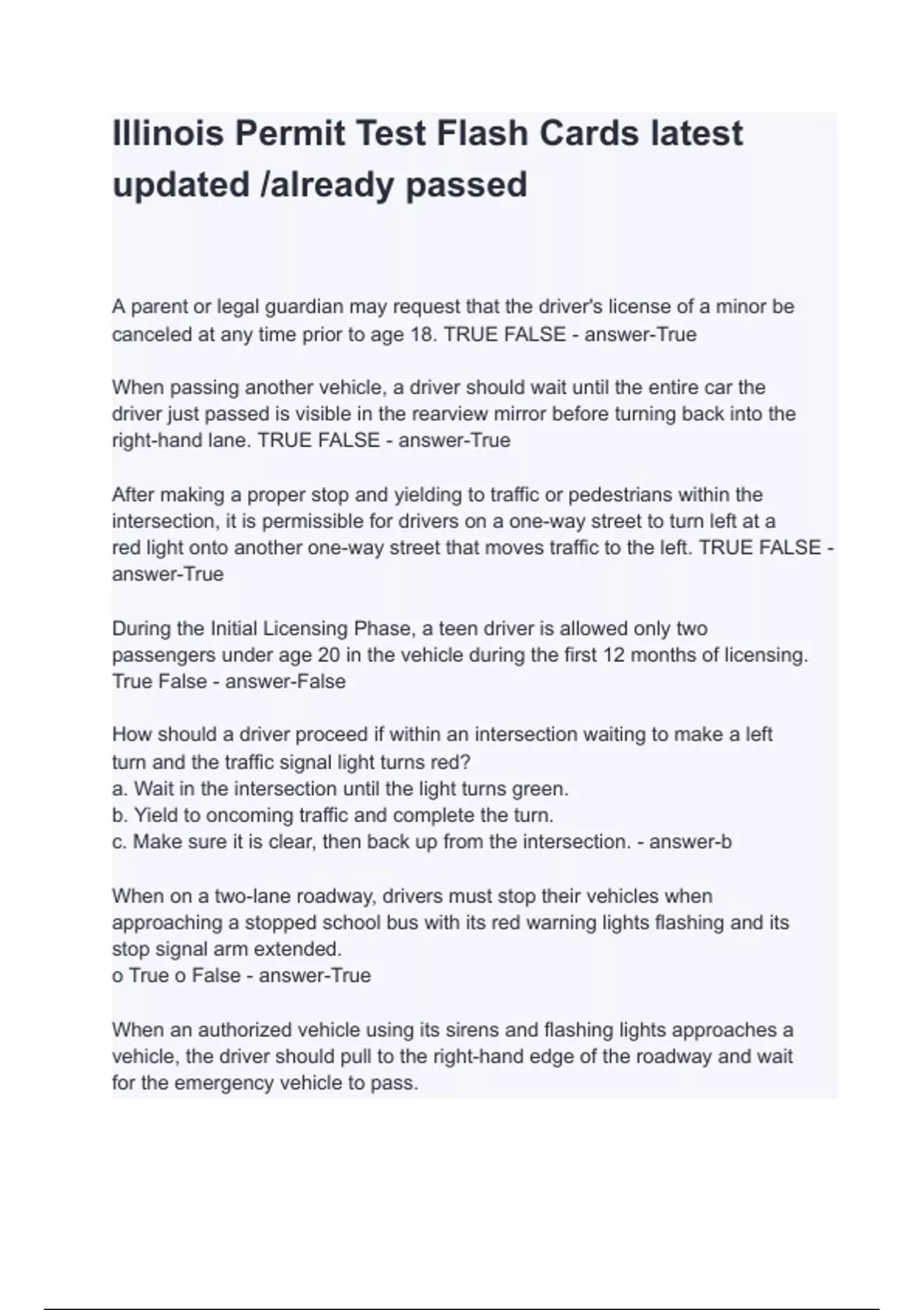 Illinois Permit Test Flash Cards latest updated /already passed A parent or legal guardian may request that the driver's license of a minor be canceled at any time prior to age 18. TRUE FALSE - answer-True When passing another vehicle, a driver should wait until the entire car the driver just passed is visible in the rearview mirror before turning back into the right-hand lane. TRUE FALSE - answer-True After making a proper stop and yielding to traffic or pedestrians within the intersection, it is permissible for drivers on a one-way street to turn left at a red light onto another one-way street that moves traffic to the left. TRUE FALSE - answer-True During the Initial Licensing Phase, a teen driver is allowed only two passengers und