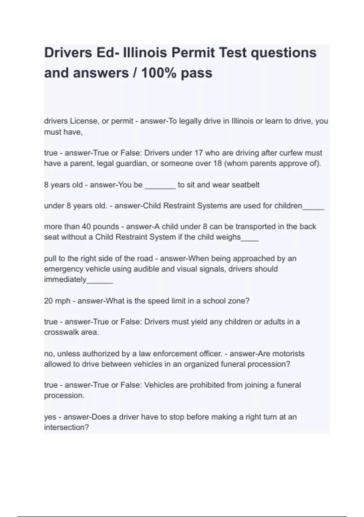Drivers Ed- Illinois Permit Test questions and answers / 100% pass drivers License, or permit - answer-To legally drive in Illinois or learn to drive, you must have, true - answer-True or False: Drivers under 17 who are driving after curfew must have a parent, legal guardian, or someone over 18 (whom parents approve of). 8 years old - answer-You be _______ to sit and wear seatbelt under 8 years old. - answer-Child Restraint Systems are used for children_____ more than 40 pounds - answer-A child under 8 can be transported in the back seat without a Child Restraint System if the child weighs____ pull to the right side of the road - answer-When being approached by an emergency vehicle using audible and visual signals, drivers should immediate