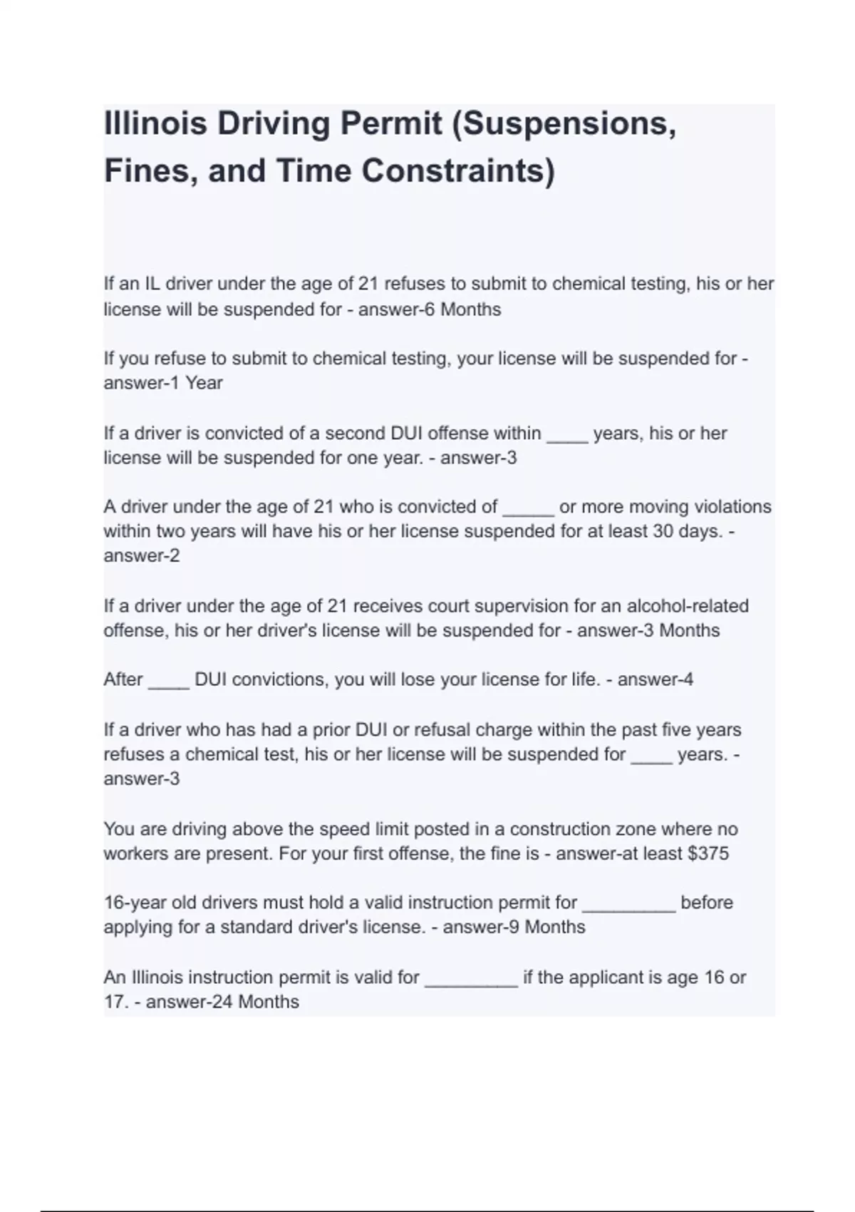 Illinois Driving Permit (Suspensions, Fines, and Time Constraints) If an IL driver under the age of 21 refuses to submit to chemical testing, his or her license will be suspended for - answer-6 Months If you refuse to submit to chemical testing, your license will be suspended for - answer-1 Year If a driver is convicted of a second DUI offense within ____ years, his or her license will be suspended for one year. - answer-3 A driver under the age of 21 who is convicted of _____ or more moving violations within two years will have his or her license suspended for at least 30 days. - answer-2 If a driver under the age of 21 receives court supervision for an alcohol-related offense, his or her driver's license will be suspended for - answer-3 Months After ____ DUI convictions, you will lose your license for life. - answer-4 If a driver who h