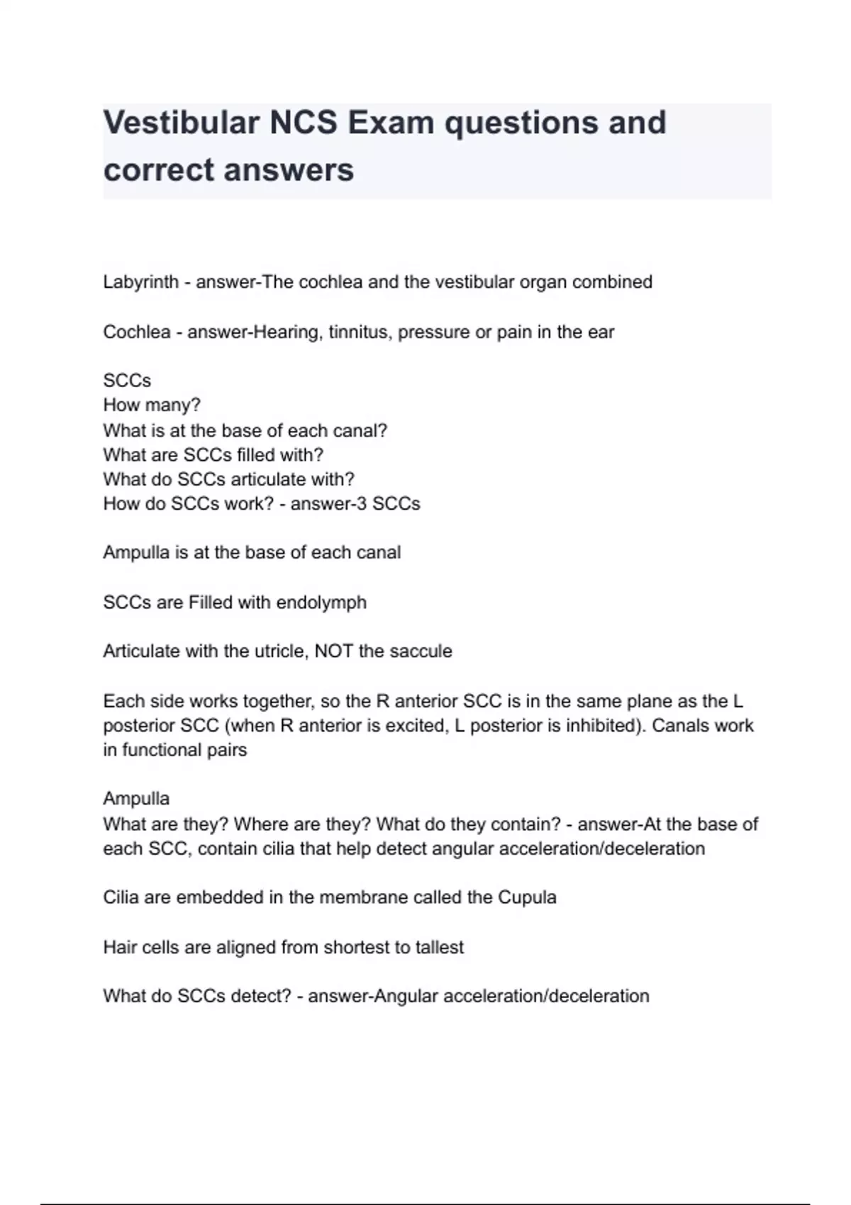Vestibular NCS Exam questions and correct answers Labyrinth - answer-The cochlea and the vestibular organ combined Cochlea - answer-Hearing, tinnitus, pressure or pain in the ear SCCs How many? What is at the base of each canal? What are SCCs filled with? What do SCCs articulate with? How do SCCs work? - answer-3 SCCs Ampulla is at the base of each canal SCCs are Filled with endolymph Articulate with the utricle, NOT the saccule Each side works together, so the R anterior SCC is in the same plane as the L posterior SCC (when R anterior is excited, L posterior is inhibited). Canals work in functional pa