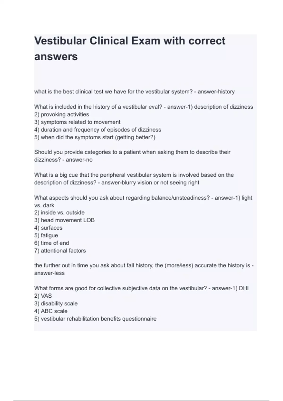 Vestibular Clinical Exam with correct answers what is the best clinical test we have for the vestibular system? - answer-history What is included in the history of a vestibular eval? - answer-1) description of dizziness 2) provoking activities 3) symptoms related to movement 4) duration and frequency of episodes of dizziness 5) when did the symptoms start (getting better?) Should you provide categories to a patient when asking them to describe their dizziness? - answer-no What is a big cue that the peripheral vestibular system is involved based on the description of dizziness? - answer-blurry vision or not seeing right What aspects should you ask about regarding balance/unsteadiness? - answer-1) light vs. dark 2) inside vs. outside 3) head movement LOB 4) surfaces