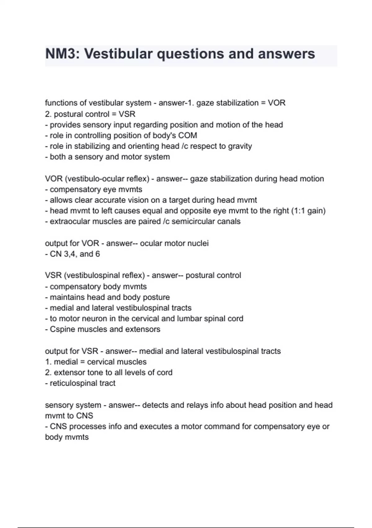 NM3: Vestibular questions and answers functions of vestibular system - answer-1. gaze stabilization = VOR 2. postural control = VSR - provides sensory input regarding position and motion of the head - role in controlling position of body's COM - role in stabilizing and orienting head /c respect to gravity - both a sensory and motor system VOR (vestibulo-ocular reflex) - answer-- gaze stabilization during head motion - compensatory eye mvmts - allows clear accurate vision on a target during head mvmt - head mvmt to left causes equal and opposite eye mvmt to the right (1:1 gain) - extraocular muscles are paired /c semicircular canals output for VOR - answer-- ocular motor nuclei - CN 3,4, and 6 VSR (vestibulospinal reflex) - answer-- postural control - compensatory body mvmts - maintains head and body posture - medial and lateral vestibulospinal tracts - to motor neuron in the cervical and lumbar spinal cord - Cspine muscles and extensors output for VSR - answer-- medial and lateral vestibulospinal tracts 1. medial = cervi
